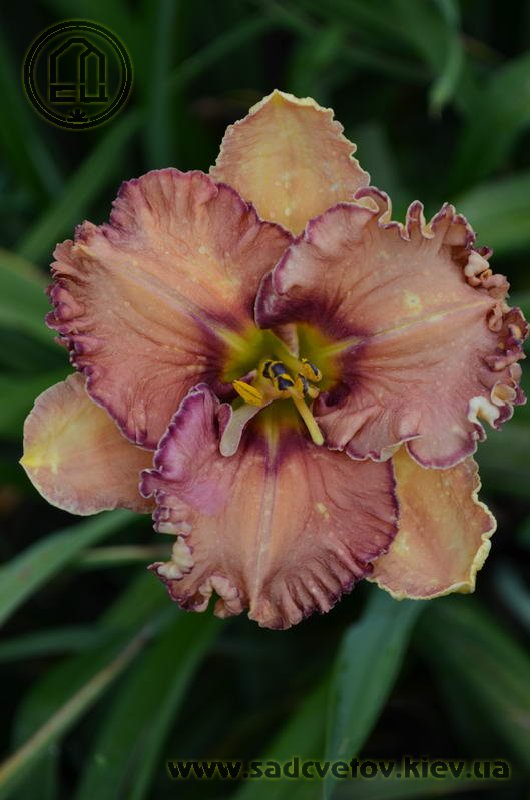 Гофрований охристий, персиково-абрикосовий з червоно-коричневими оком і облямівкою тоненькою ниткою по краю. Жовте горло.