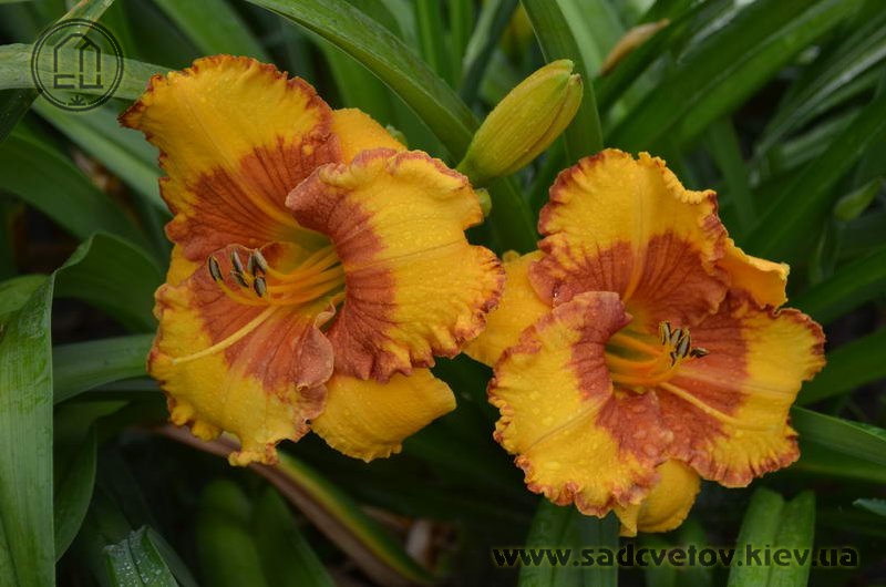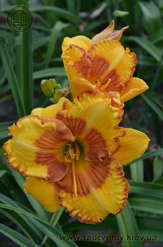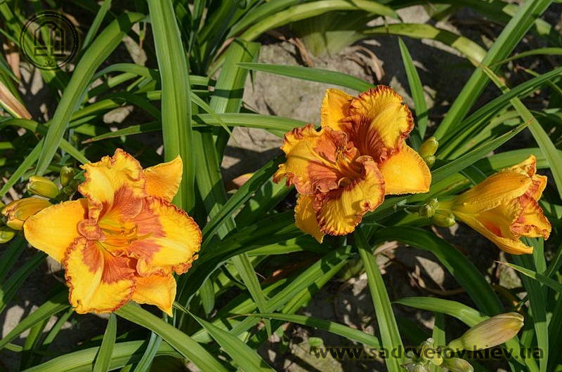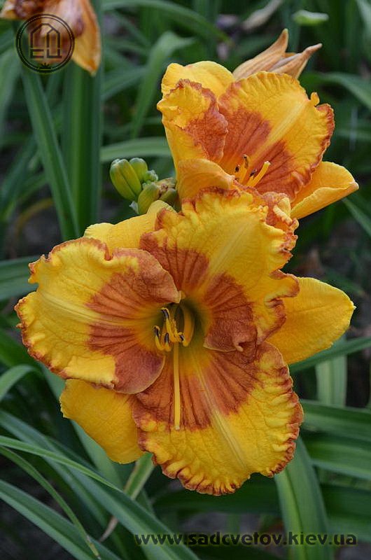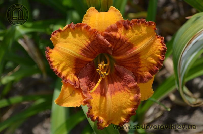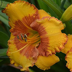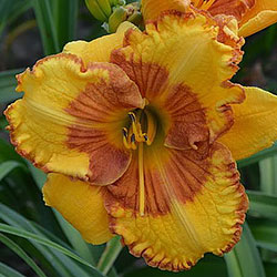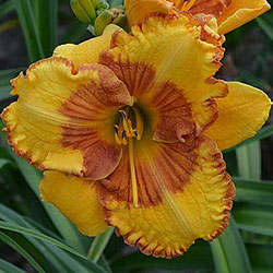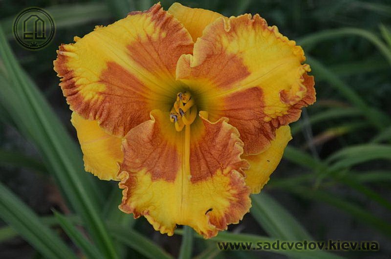 Круглий гофрований яскраво-жовтий з приглушеними червоними оком і облямівкою.
