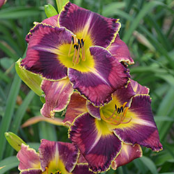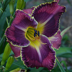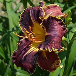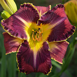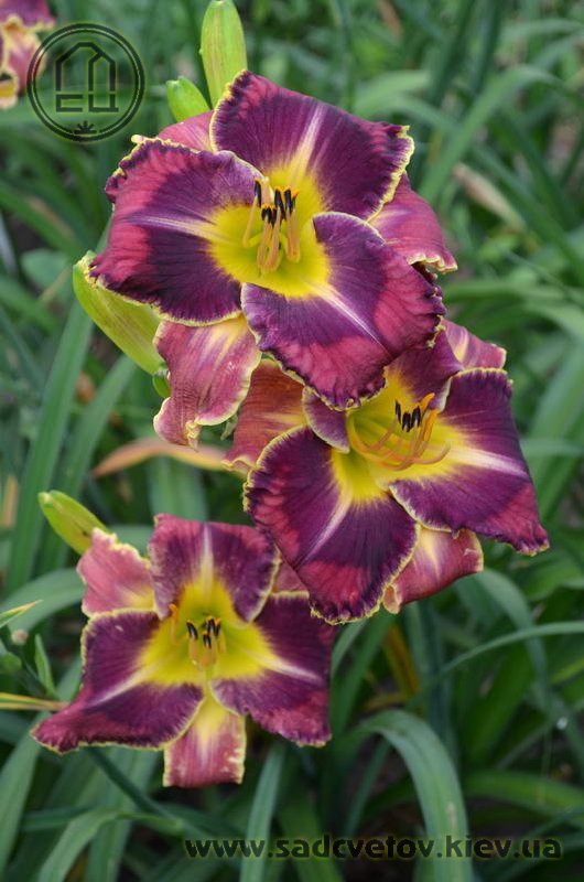 Великий гофрований коралово-червоний з великим вишневим оком розсіченим яскравим білим променем із жовто-лимонного горла та подвійною облямівкою кольорів ока та горла.