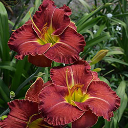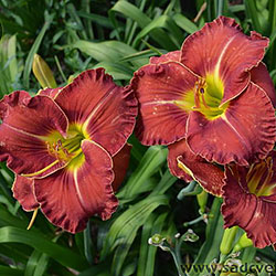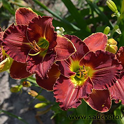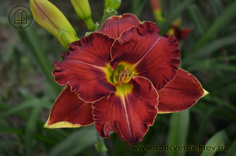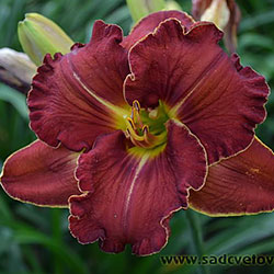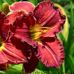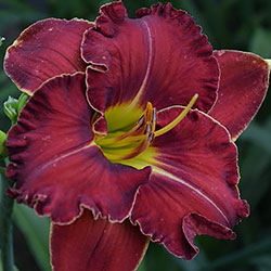 Гофрований оксамитовий вишнево-червоний з тонкою жовтою окантовкою, вишневим оком розсіченим білими осьовими променями і зелено-жовтим горлом.