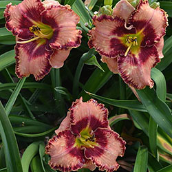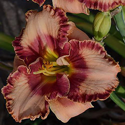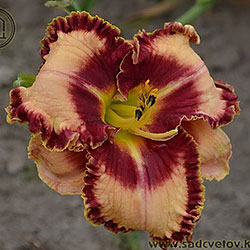 Круглий ніжний рожевий, яскраве вишнево червоне око навколо зеленого горлечка, така ж вишнево червона широка гофрована облямівка з вузьким золотистим краєм.