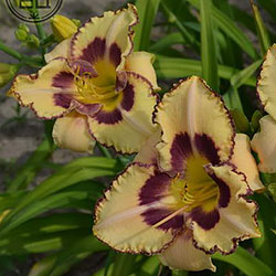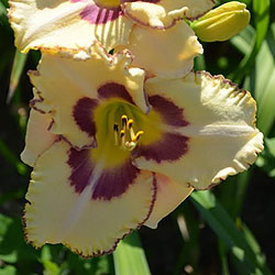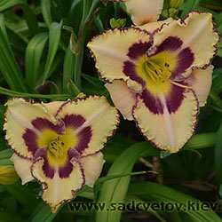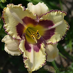 Молочно-кремовий з сливово-фіолетовим оком і такою ж тонкою каймою по гофрованому краю пелюстки.