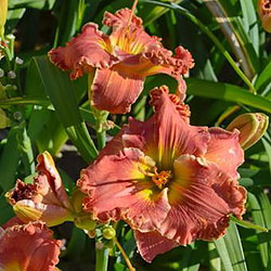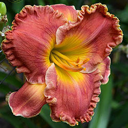 Добре гофрований, насичений темно-рожевий з акварельним розмитим оком навколо жовто-лимонного горла, золотиста облямівка по краю.