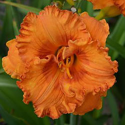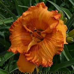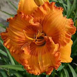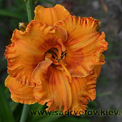 Супергофрований помаранчевий. Внутрішні частки оцвітини мандаринові з червоним оком і тонкою облямівкою по краю, зовнішні частки - апельсинові. Дуже гарячий за кольором.