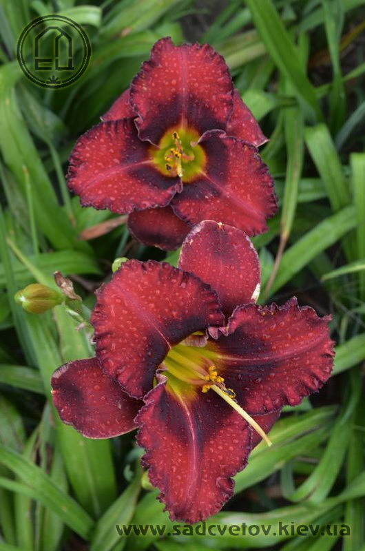 Темний вишневий з чорно-вишневим оком і такою ж гофрованою тонкою каймою, горло - від оранжевого через жовтий до лимонно-зеленого.