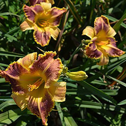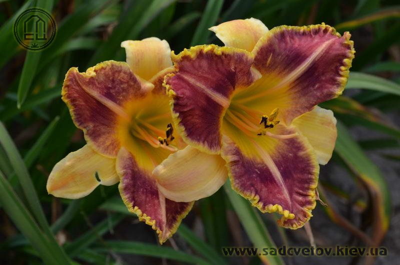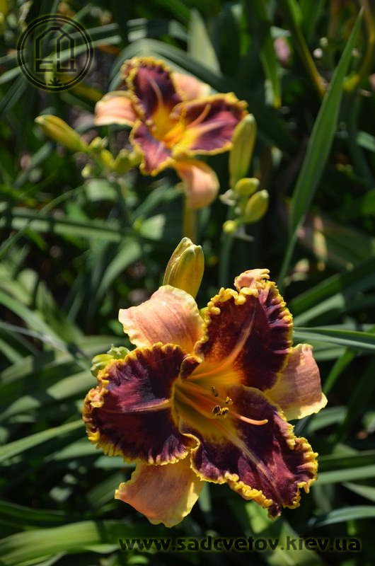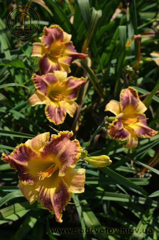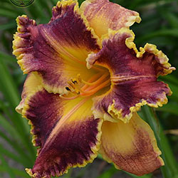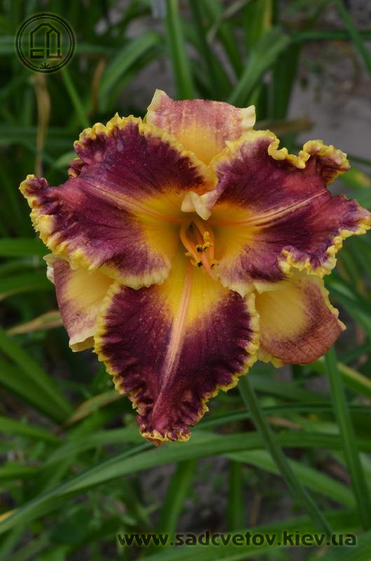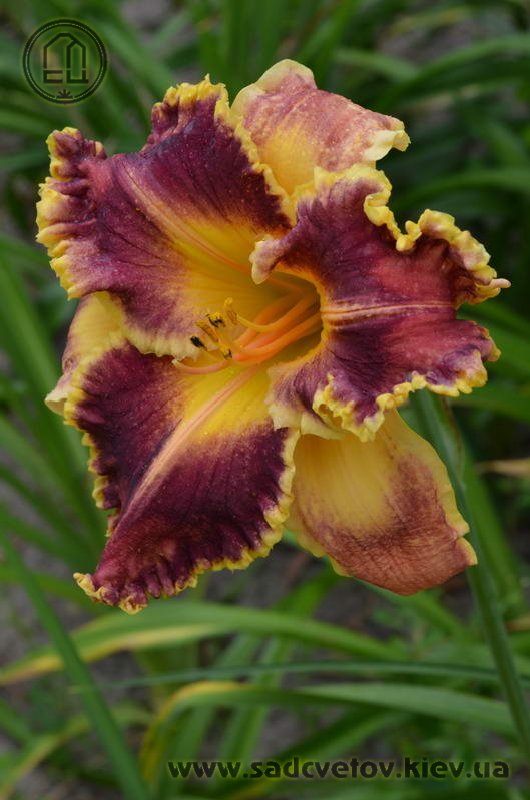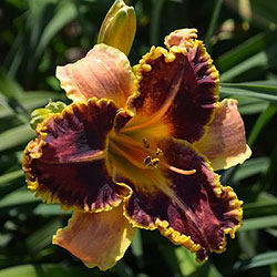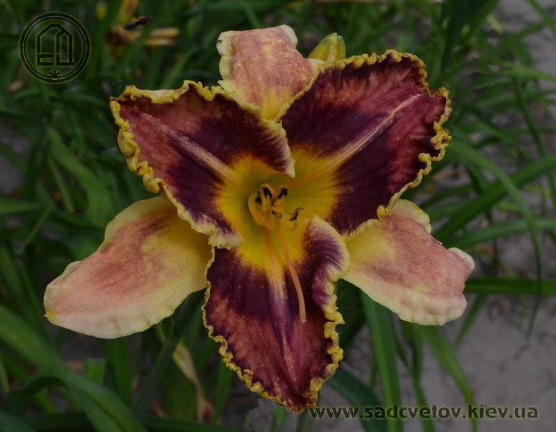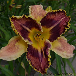 Гофрований червоно-коричневий з темно-вишневим оком, лимонним горлом, ярко вираженою двоколірною (око, горло) облямівкою і світлими помаранчевими променями по середині пелюстки.