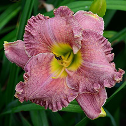 Незвичайний муаровий рожевий з золотистими і сріблястими вкрапленнями з широко гофрованим краєм, лимонно-зелене горло.
