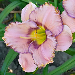 Рожевий з фіолетово-малиновим оком і облямівкою по гофрованому з золотистими мереживами краю, лимонно-зелене горло.