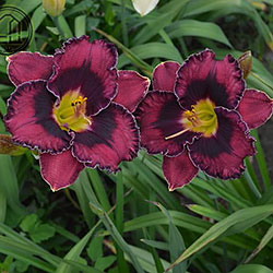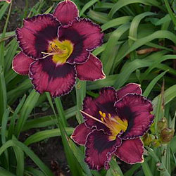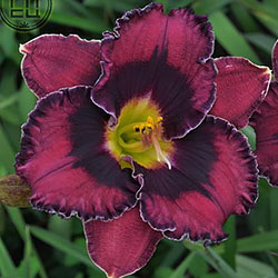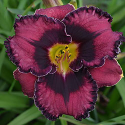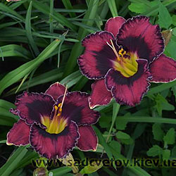 Прекрасно гофрований темно-малиновий з чорно-вишневим оком такою ж мереживною облямівкою окресленою тонкою білою ниткою по краю, горло жовто-зелене.