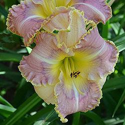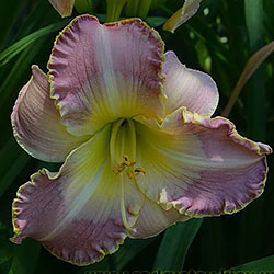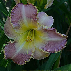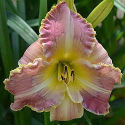 Гофрований ніжний блідо-рожевий з великим перламутровим оком окресленим насиченням фонового кольору, жовта тонка облямівка по краю, жовте горло.