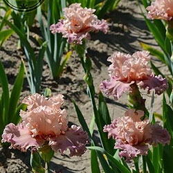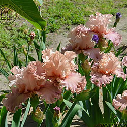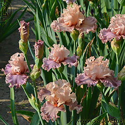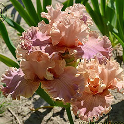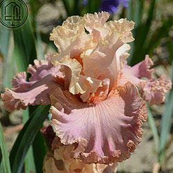 Дуже гофрована мереживна квітка. Ст. - блідий оранжево-жовтий з блідим жовтим мереживним краєм, світла жовтувато-рожева серединка, ф. - кольору стандартів в основі з віялом дуже блідих пурпурних прожилок по всій поверхні фол, які зливаються в дуже блідий пурпурний і гофрований край, б. - чистий оранжевий.