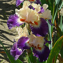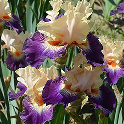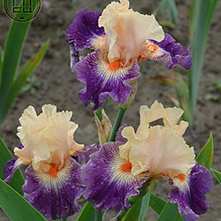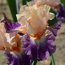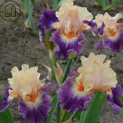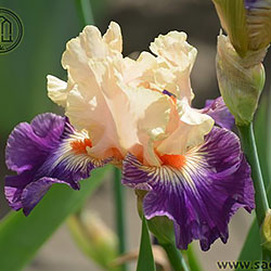 Хвиляста гофрована квітка. Ніжні кремово-рожеві ст .. На фіолетових з блакитним висвітленим краєм фолах густі персикові промені навколо великої яскравої червоно-оранжевої б ..
