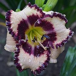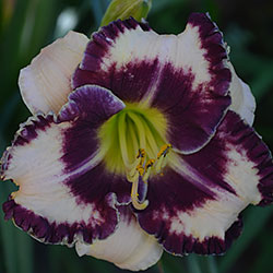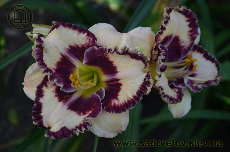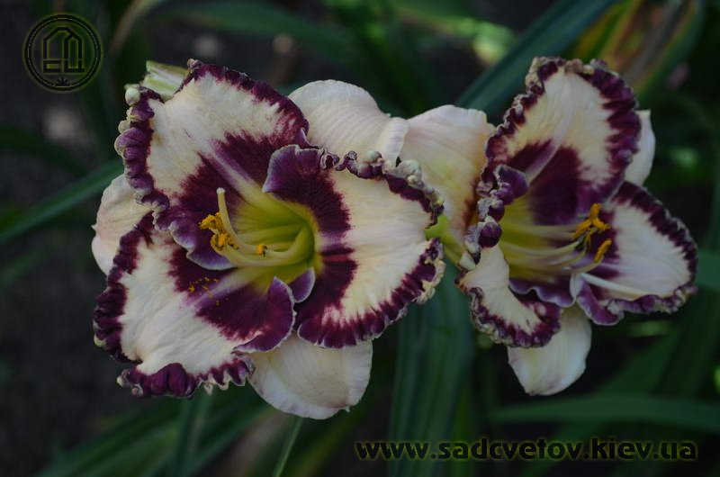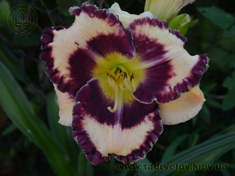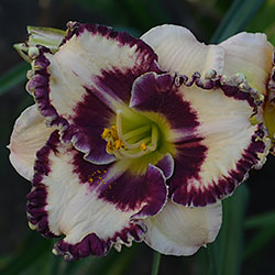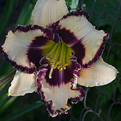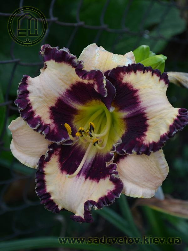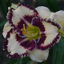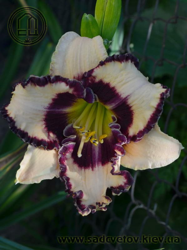Акуратна гофрована контрастна біло-кремова квітка з темним вишневим оком розсіченим світлими променями з лимонного горла і широкою каймою кольору ока.
