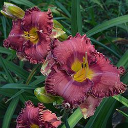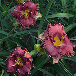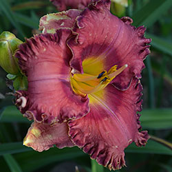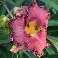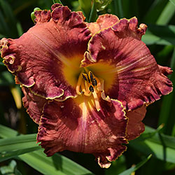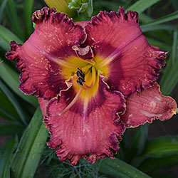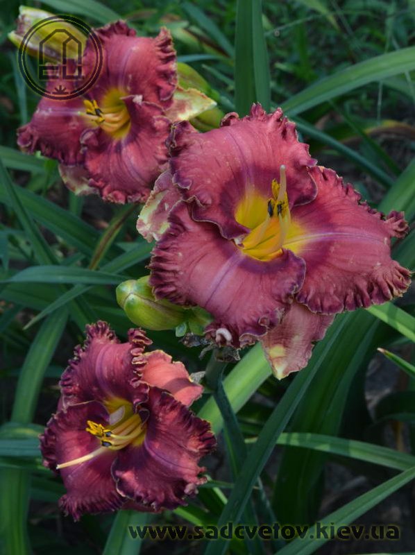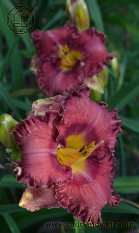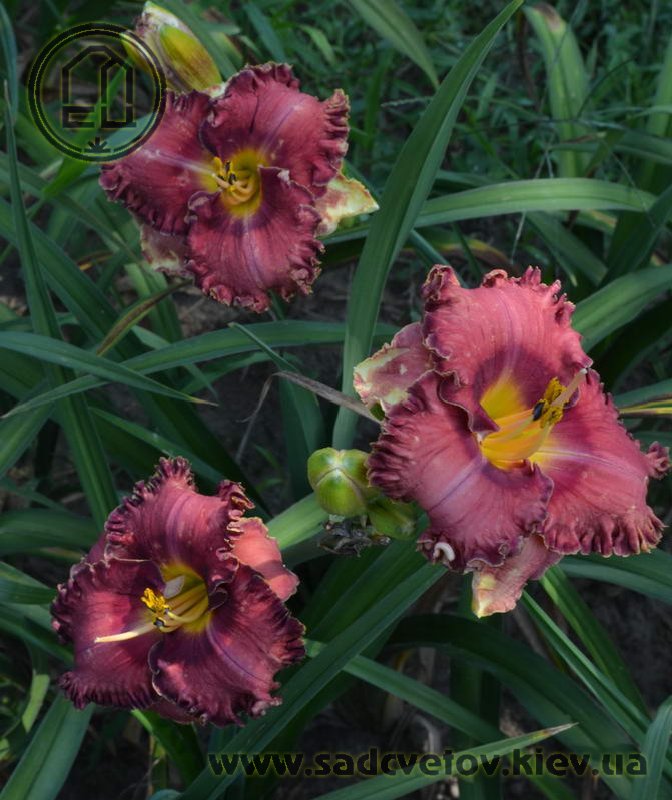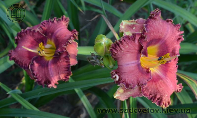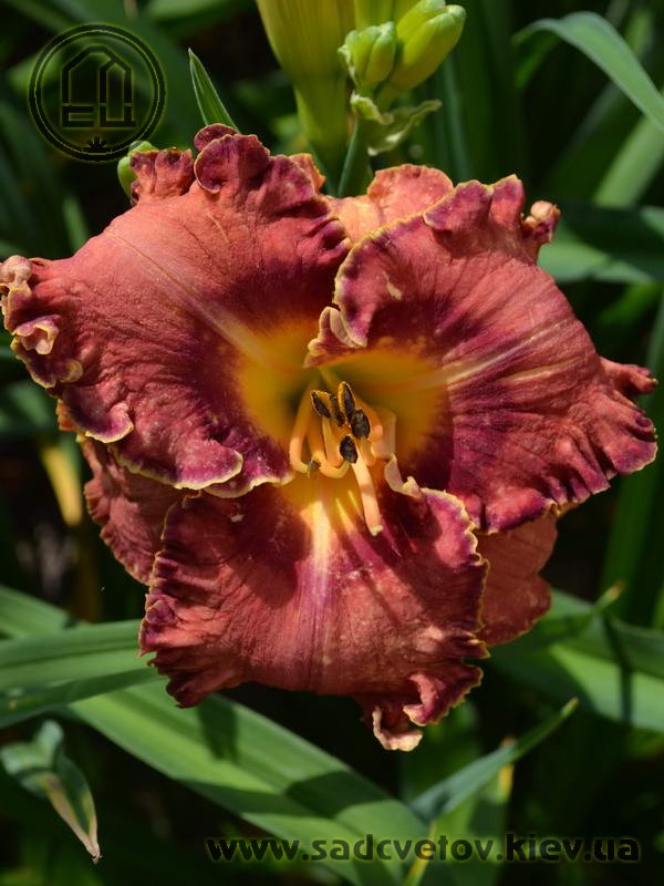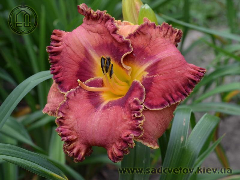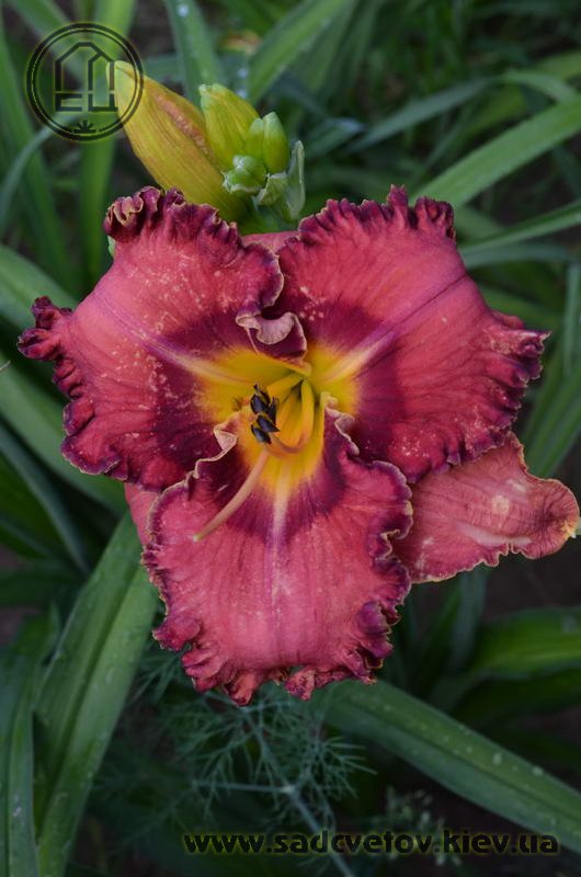 Гофрований коралово-червоний з бордово-малиновим оком і такою ж облямівкою, жовто-лимонне горло.