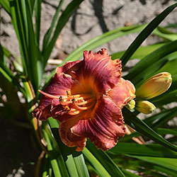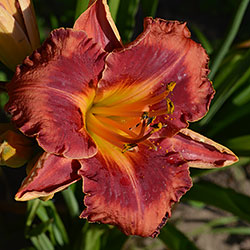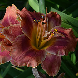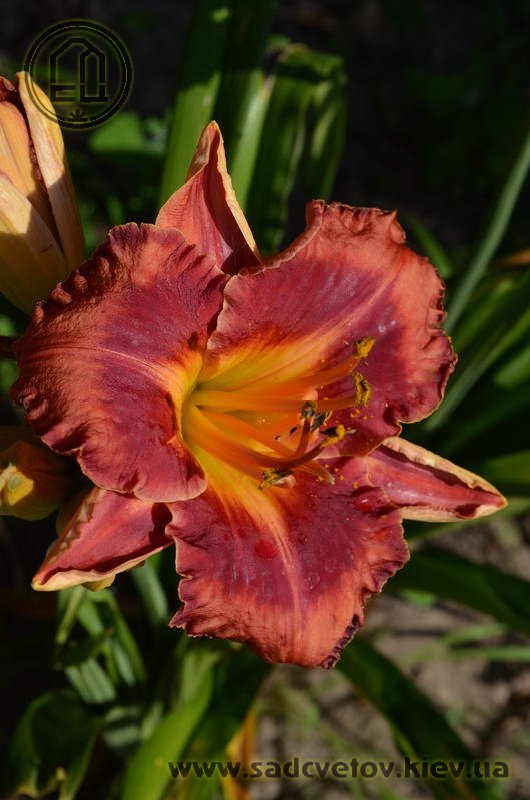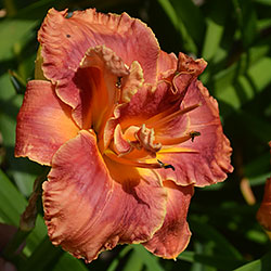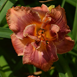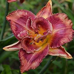 Гофрований кораловий з малиново-червоним оком і помаранчевим горлом. Махровість мінлива, залежить від сили куща.