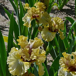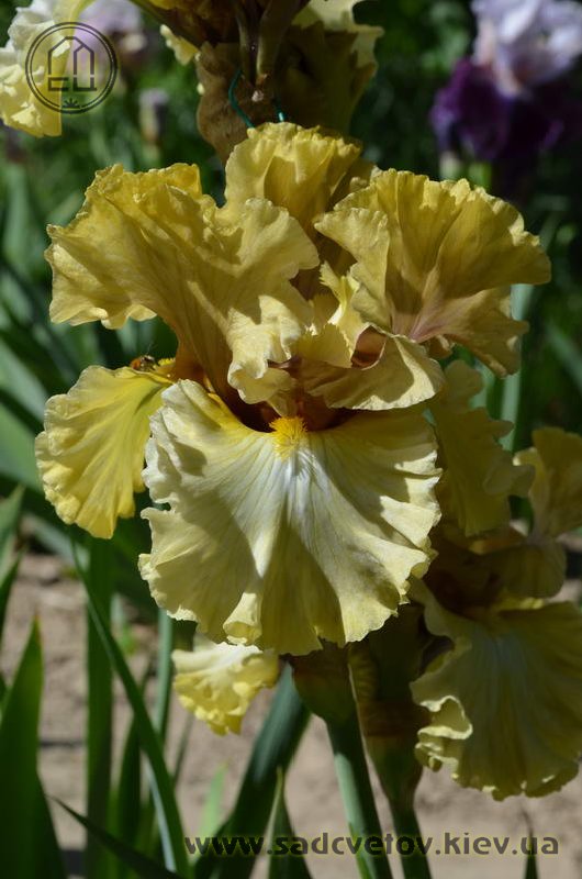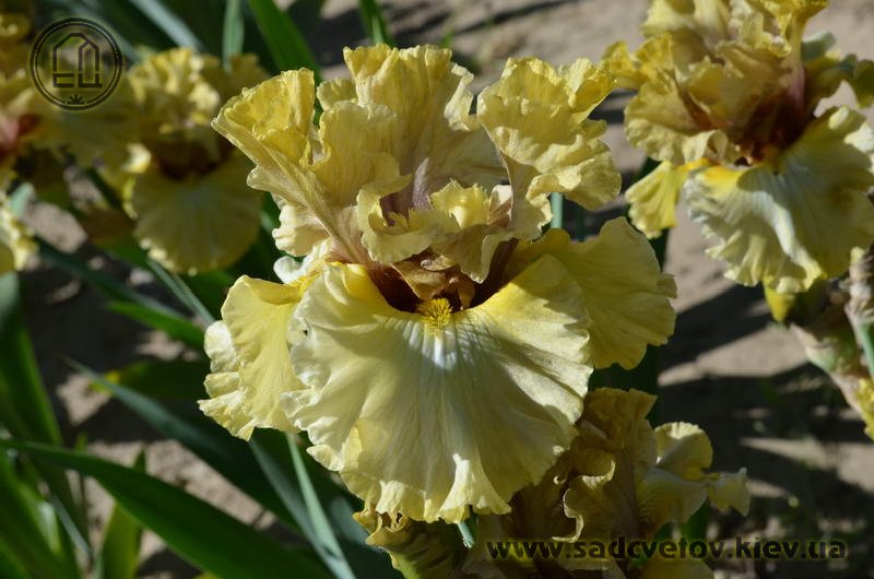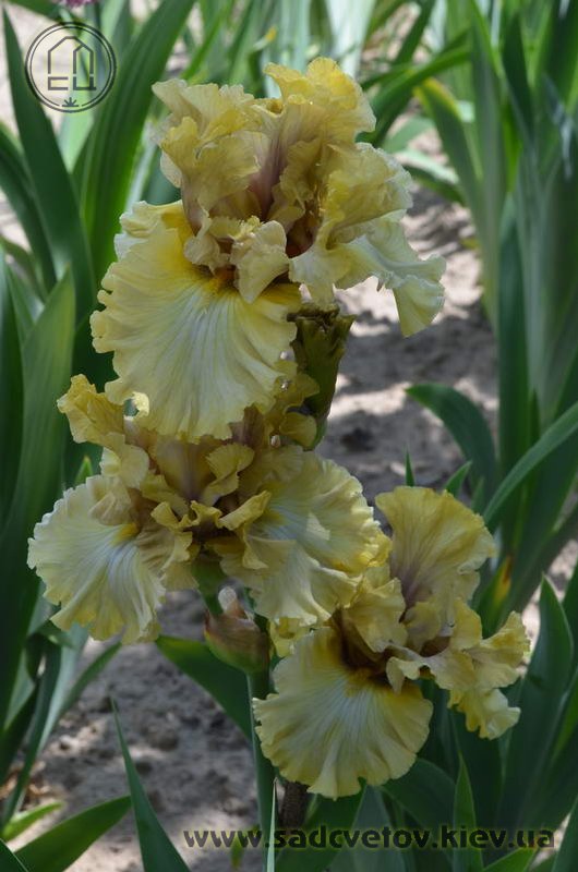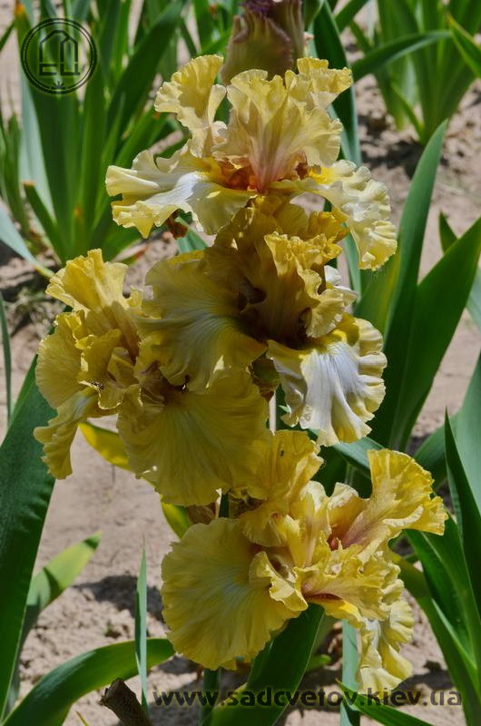 Добре гофрована кругла золотиста квітка реверсивного забарвлення. Ст. - світлий зеленувато-жовтий з устрично-лавандовим рум'янцем і віялом прожилок помірного коричневого, ф. - пліката світлих зеленувато-жовтих прожилок по краю і в плечах по біло-блакитній основі. Б. - яскравий зеленувато-жовтий.