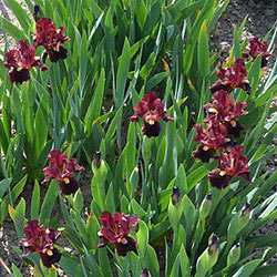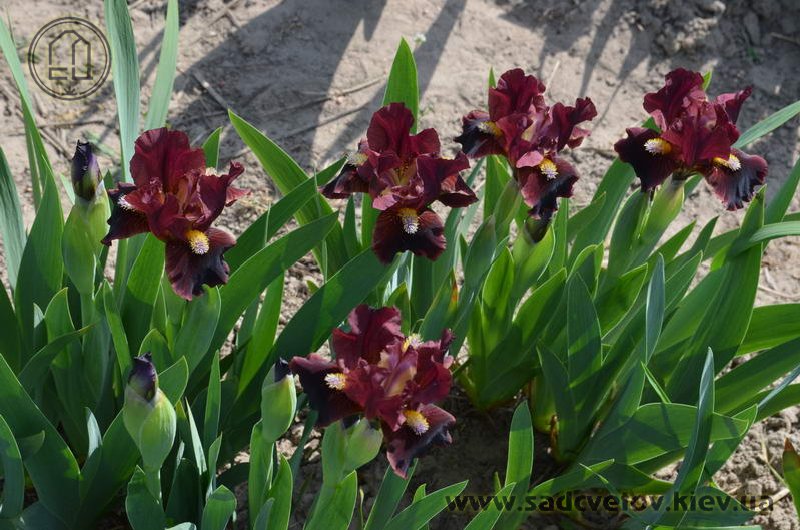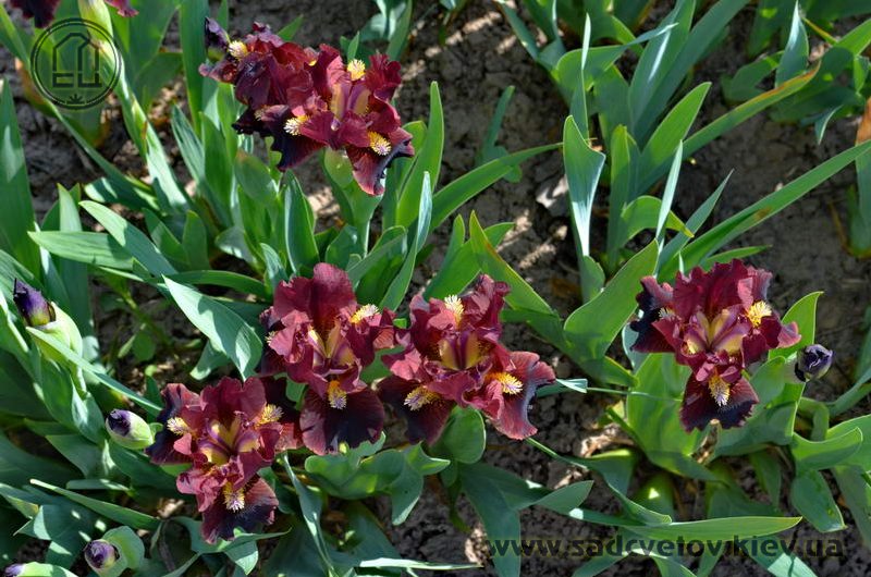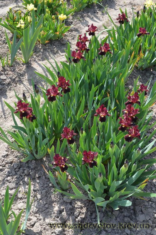 Ст. вишневі, ф. - оксамитові темно-вишневі з висвітленням до країв до рожево-червоного, б. - насичені лимонні кінчики по біло-лавандовій основі.