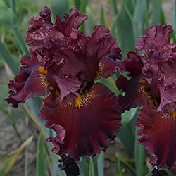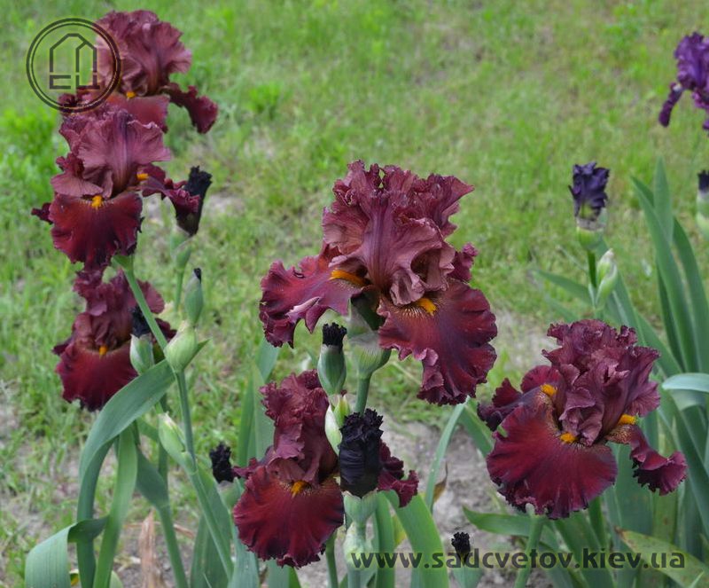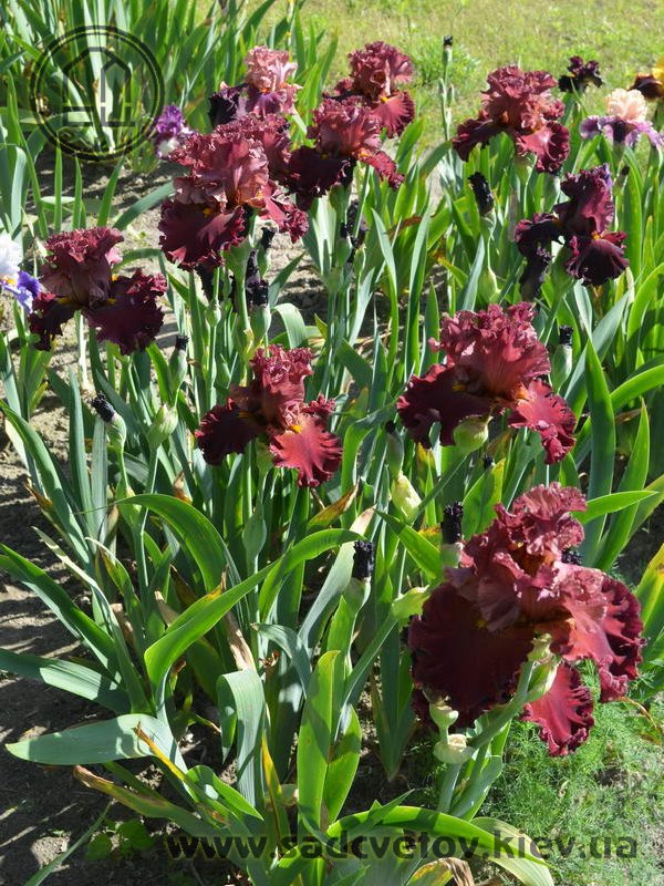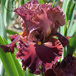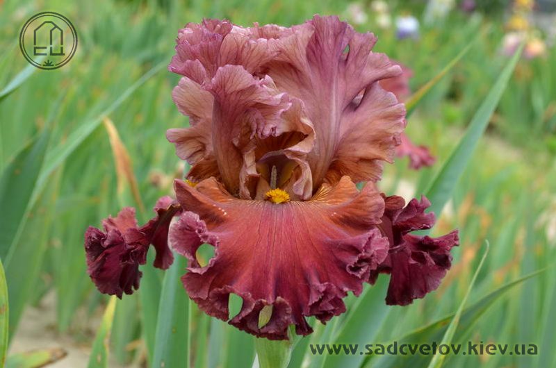 Прекрасно гофрована мереживна квітка. Ст. - зеленувато-червоно-оранжевий в основі з помірним пурпурно-червоним в середніх жилках і в верхівці стандартів, ф. - темний червоний з маленьким візерунком радіальних жовтих прожилок з боків помірно жовтої б.