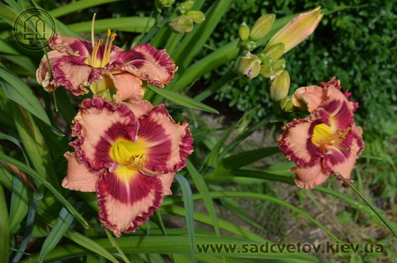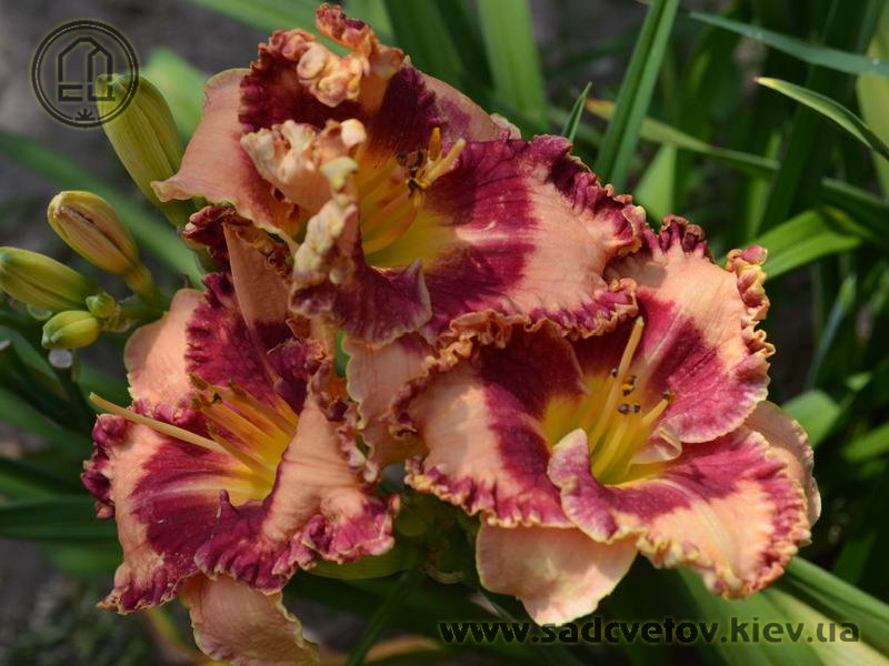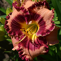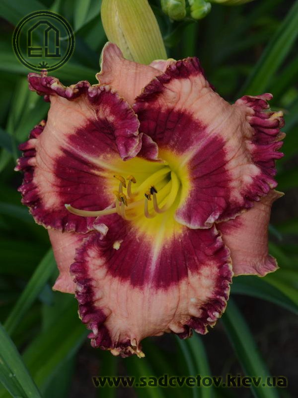 Гофрований світлий абрикосово-рожевий з яскравим насиченим карміново-червоним великим оком і такою ж широкою облямівкою по краю, лимонне горло.