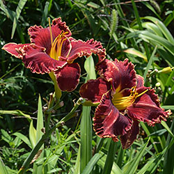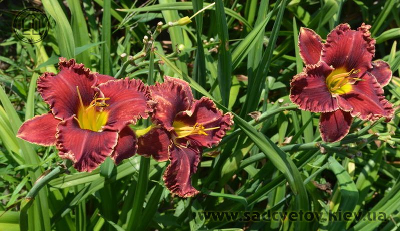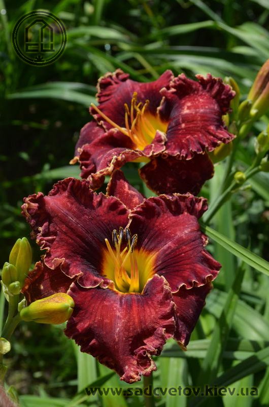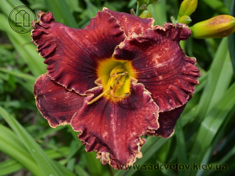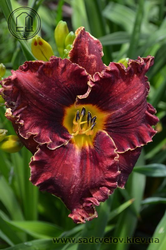 Супергофрований темно-червоний із затемненням кольору навколо жовтого горла.