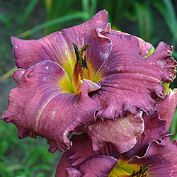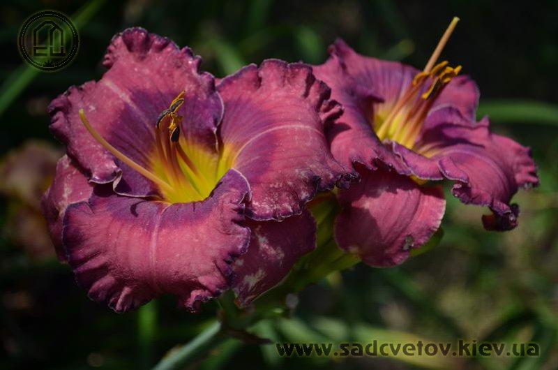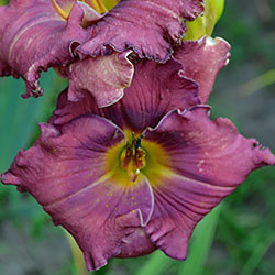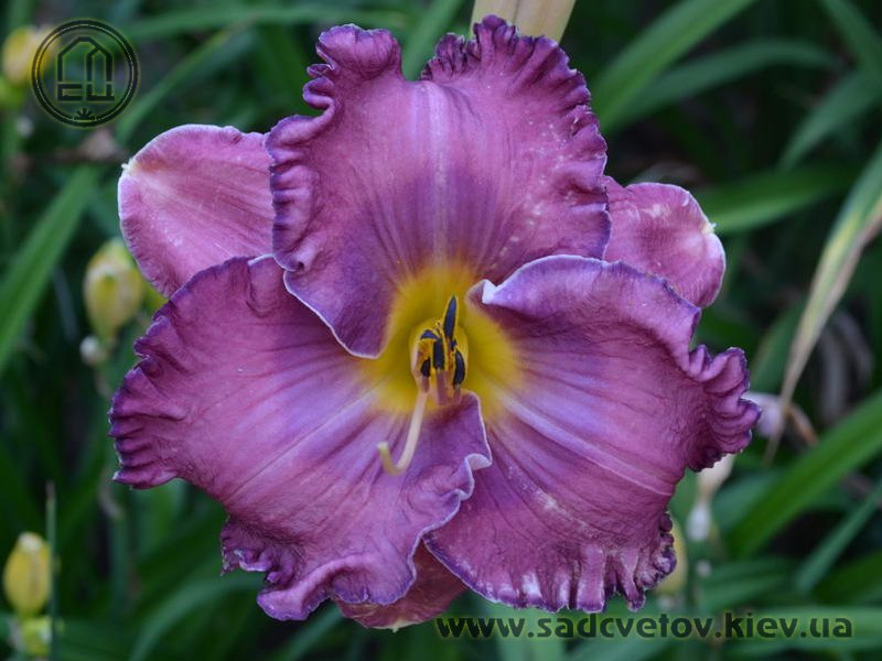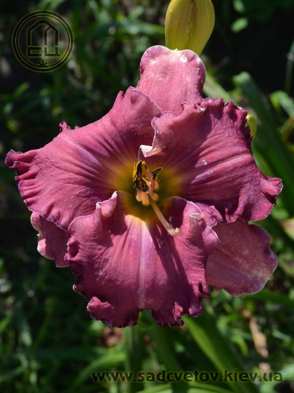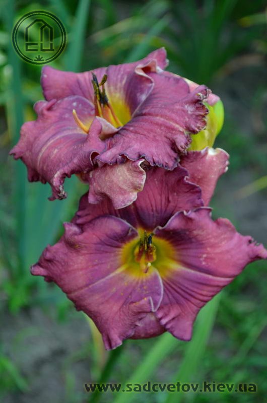Гофрований округлої форми яскравий пурпурно-рожевий з фіолетовим оком і тонкою облямівкою по краю, жовто-лимонне маленьке горлечко.
