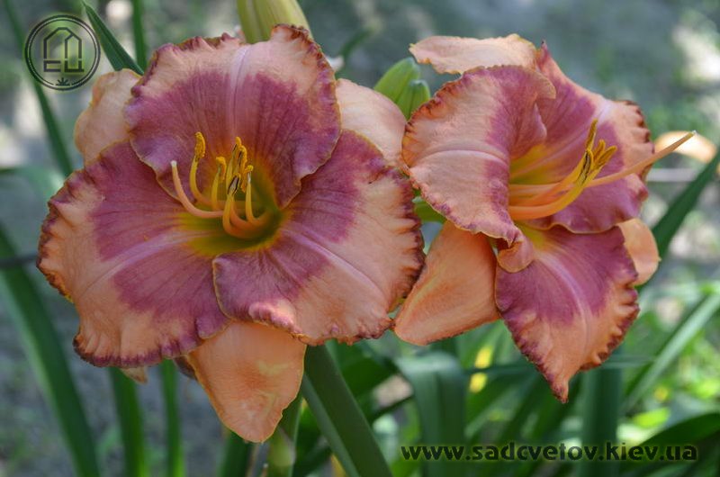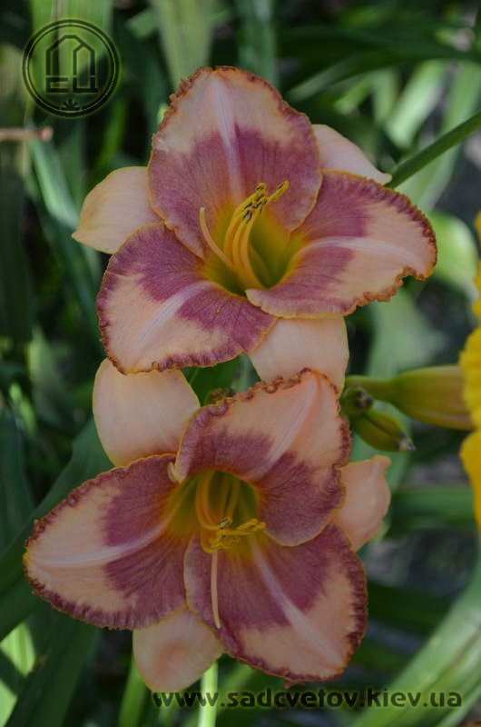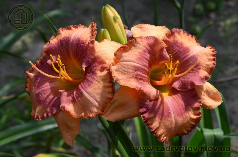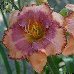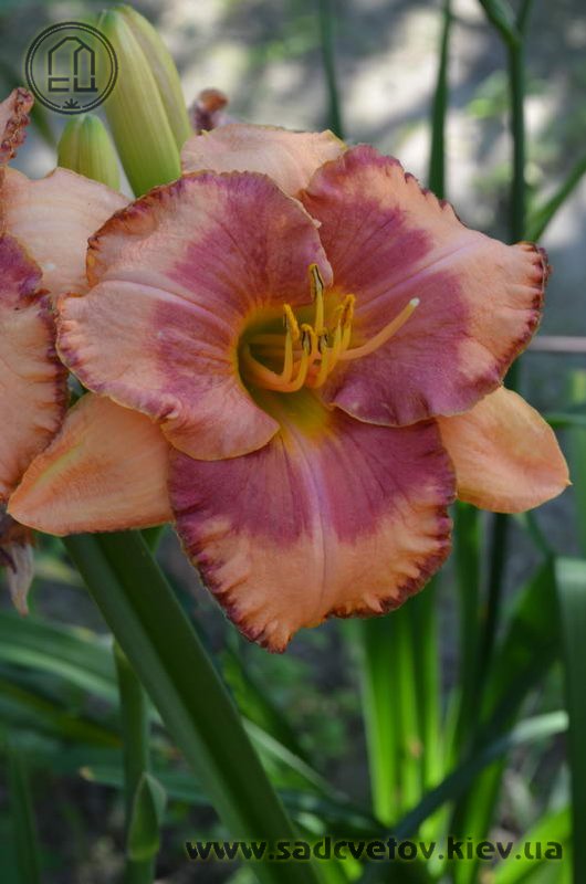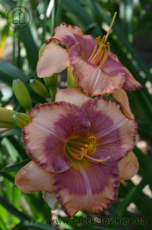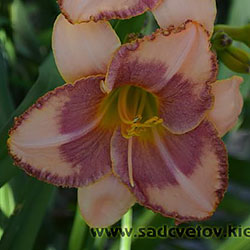 Блідий світло-помаранчевий з великим (більше половини пелюстки) рожево-теракотовим оком, такою ж темнішою гофрованою каймою по краю пелюстки, оранжево-зелене горло.