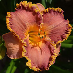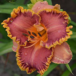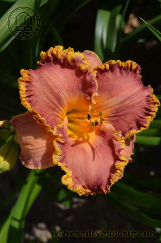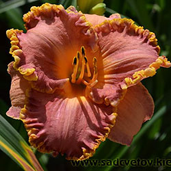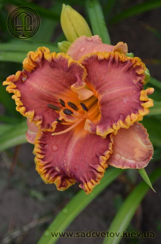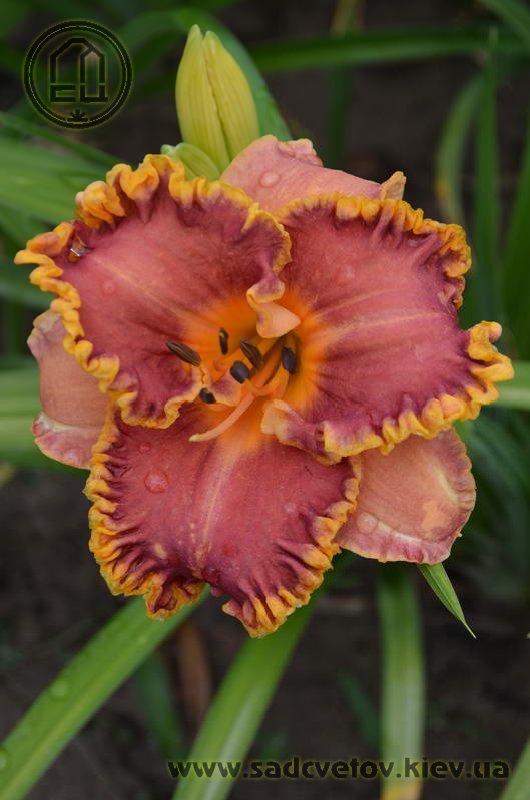 Червоно-теракотовий з помаранчевим горлом і жовто-помаранчевим щільним гофруванням по краю.