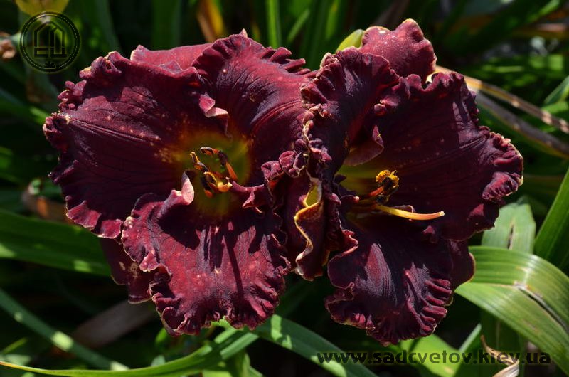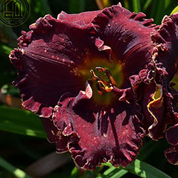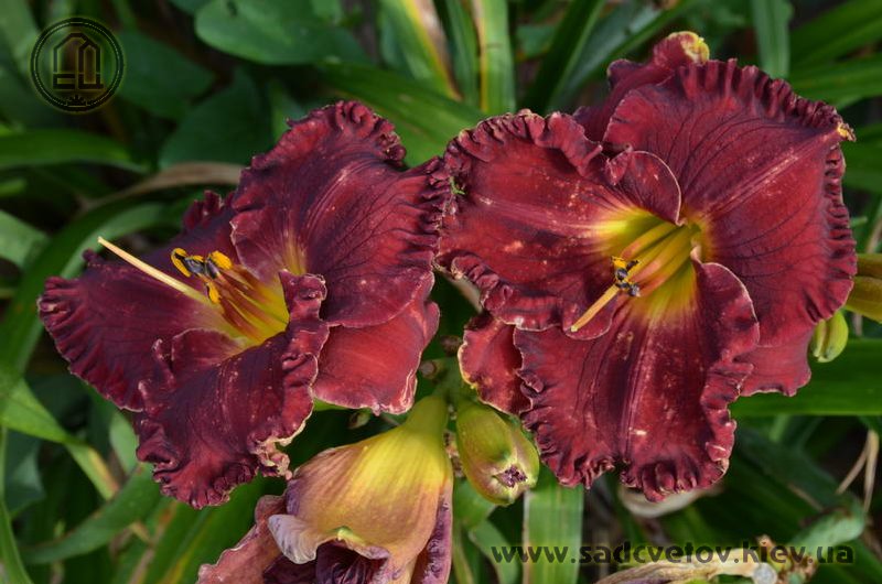 Добре гофрований темно-червоний з синім відтінком, жовте горло.