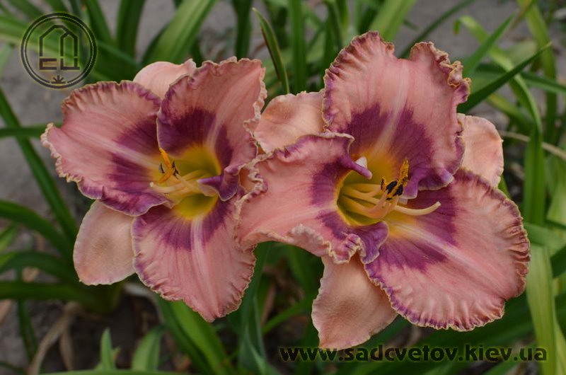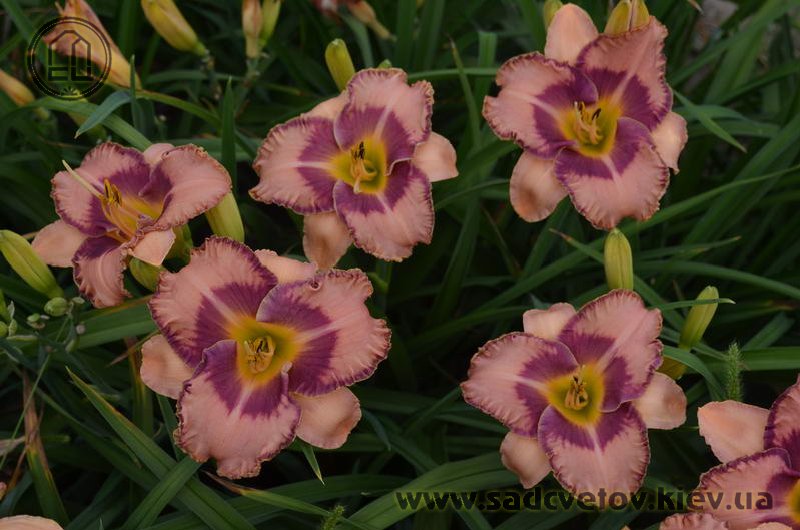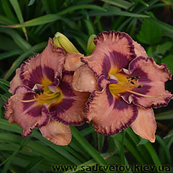Добре гофрований абрикосово-рожевий з червоно-сливовим оком такою ж виразною облямівкою окресленою золотою ниткою по краю, жовте горло із зеленою серединкою.