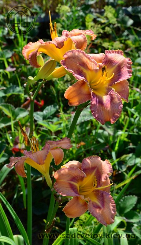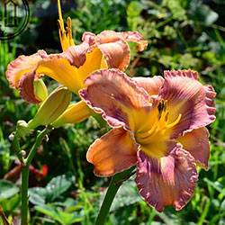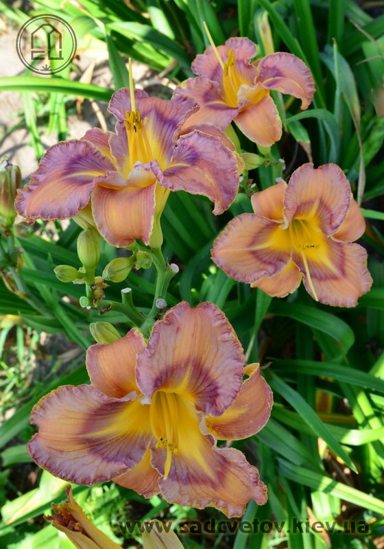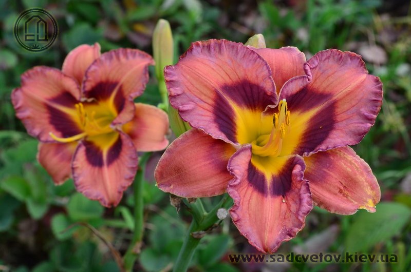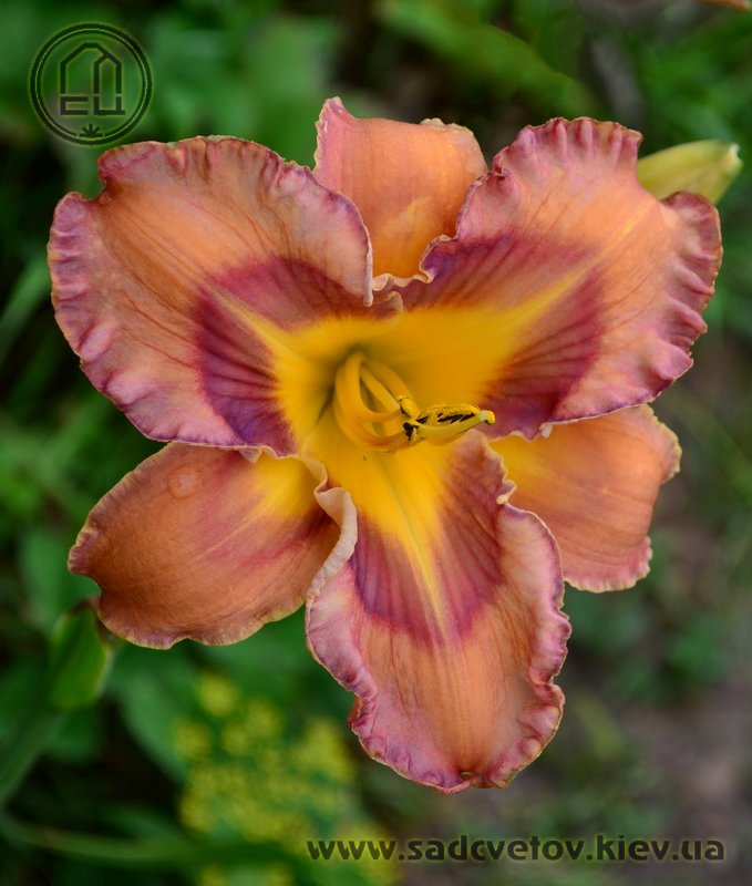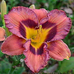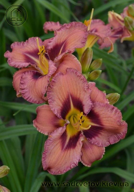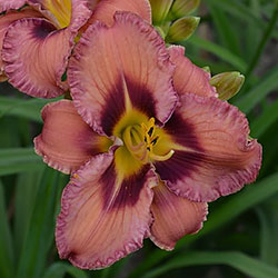 Рожево-абрикосовий з рожевими гофрованими краями і з пурпурно-коричневим оком навколо жовтого горла з промінчиками уздовж пелюсток в районі ока.