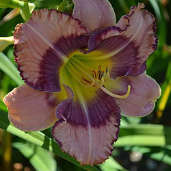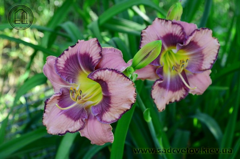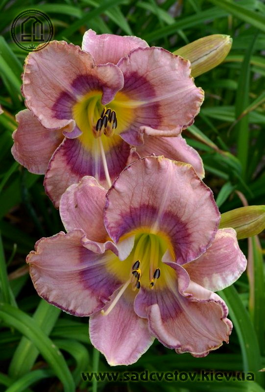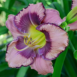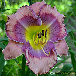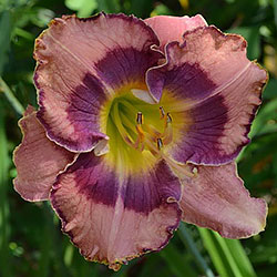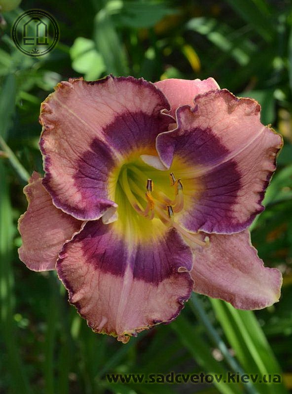 Світло-рожевий з великим лілово-лавандовим оком окресленим в розтяжку бордовою облямівкою і такою ж облямівкою по гофрованому краю пелюсток, зелено-жовте горло.