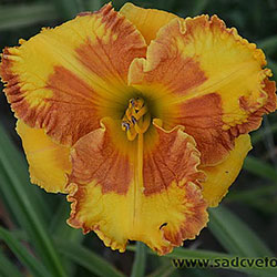 Круглий гофрований яскраво-жовтий з приглушеними червоними оком і облямівкою.
