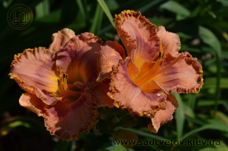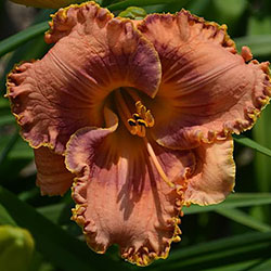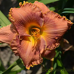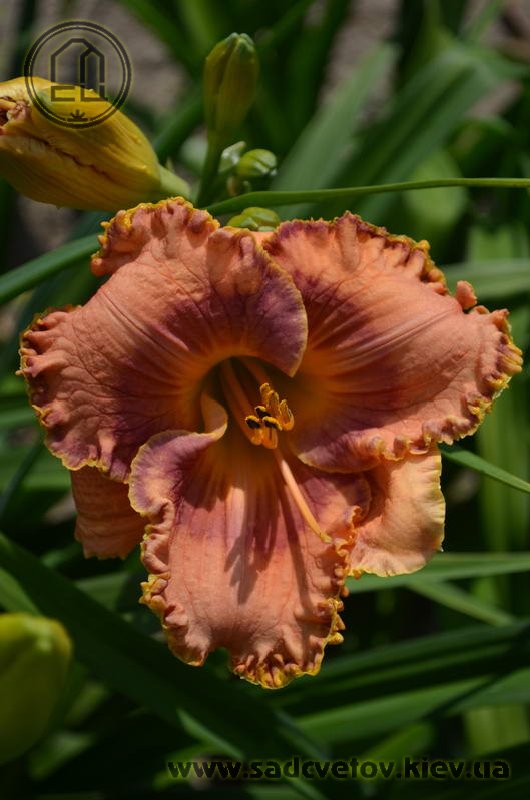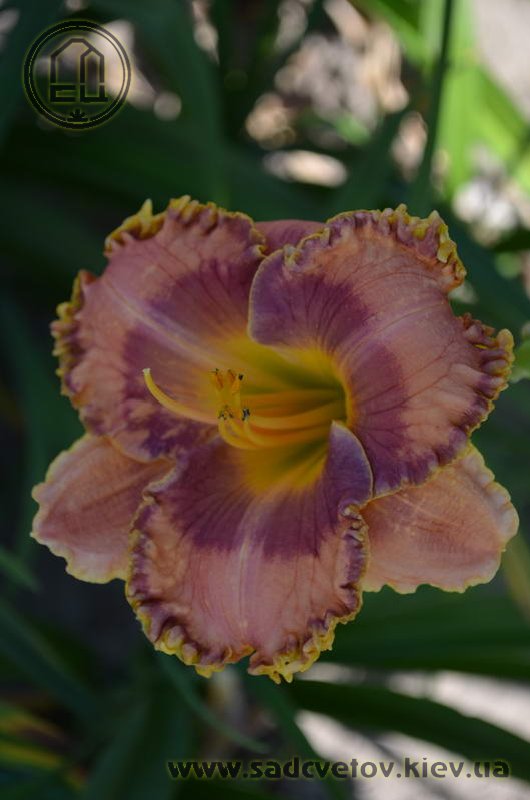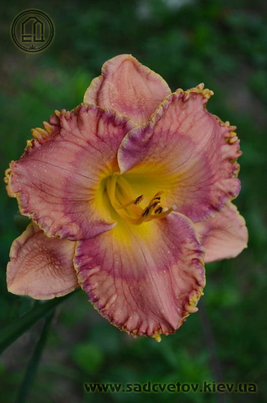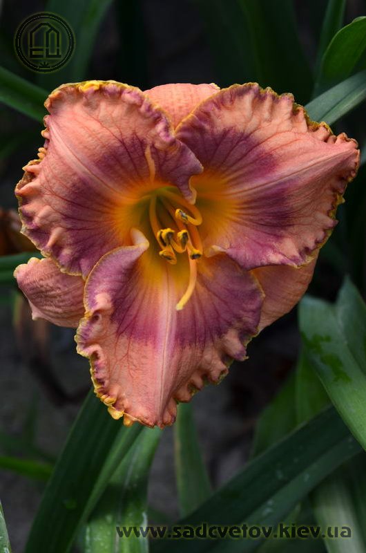 Гофрований кораловий рожевий з великим малиновим розмитим до середини акварельним оком, що перетікає в жовте горло. Золотиста з малиновим гофрована облямівка.