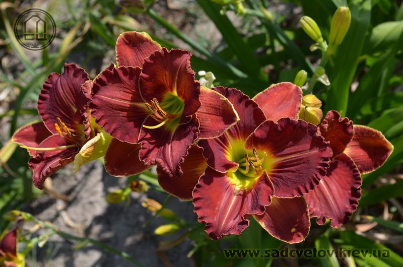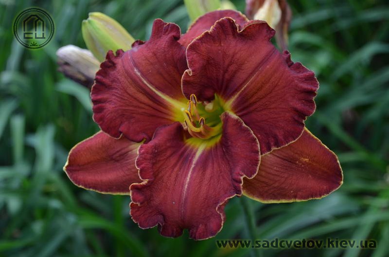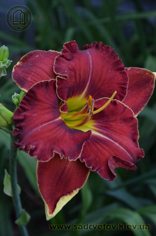 Гофрований оксамитовий вишнево-червоний з тонкою жовтою окантовкою, вишневим оком розсіченим білими осьовими променями і зелено-жовтим горлом.