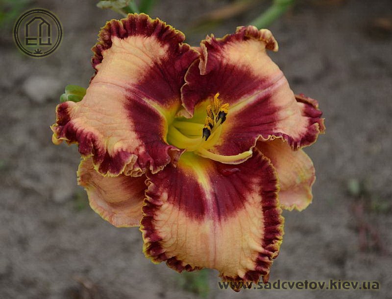 Круглий ніжний рожевий, яскраве вишнево червоне око навколо зеленого горлечка, така ж вишнево червона широка гофрована облямівка з вузьким золотистим краєм.
