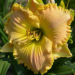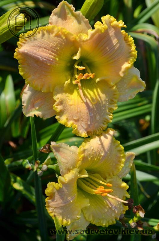 Супергофрований молочно-персиковий з лимонним горлом і такою ж прекрасно складеною бахромою по краю.