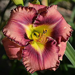 Гофрований рожевий з карміново-червоним оком і великим трикутним лимонним горлом, з тонкою облямівкою кольору ока і горла.