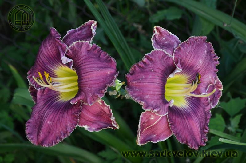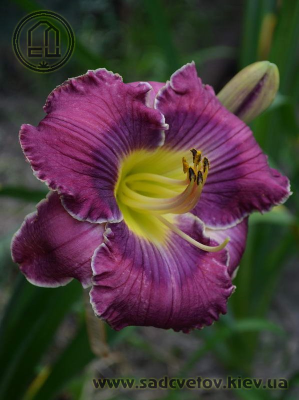 Гофрований яскравий лілово-пурпурний з фіолетовим оком і яскравим лимонним горлом, тонка світла облямівка по краю.