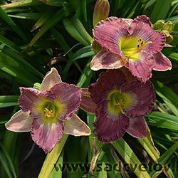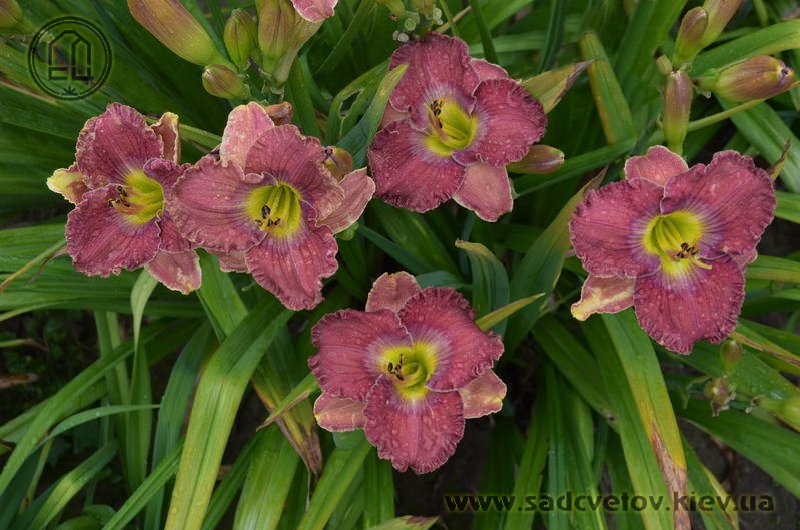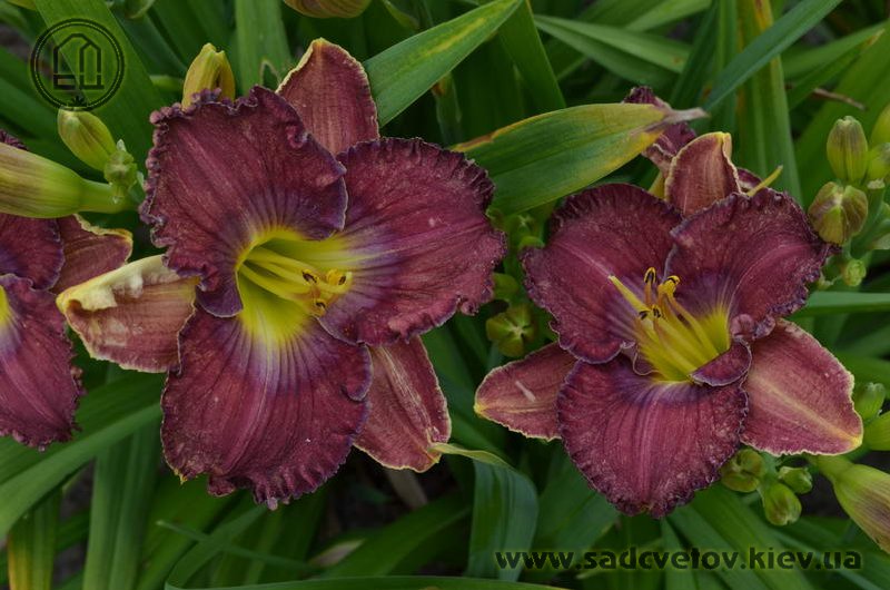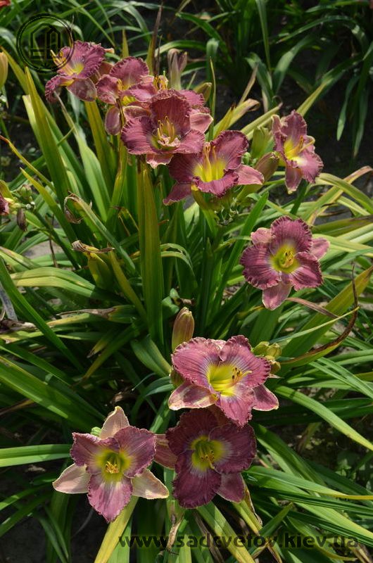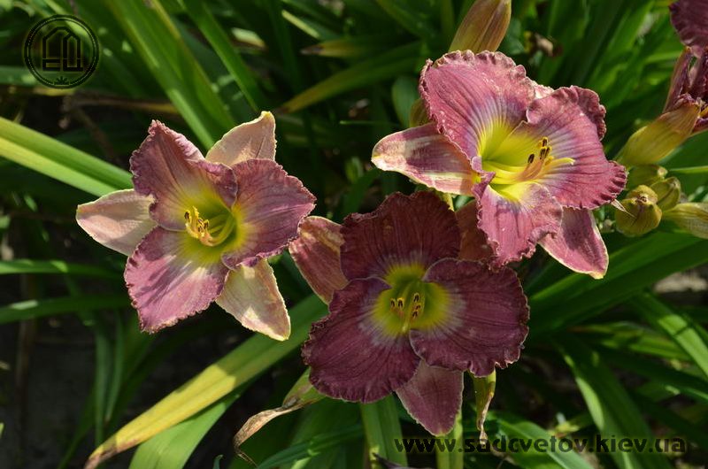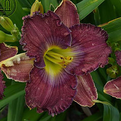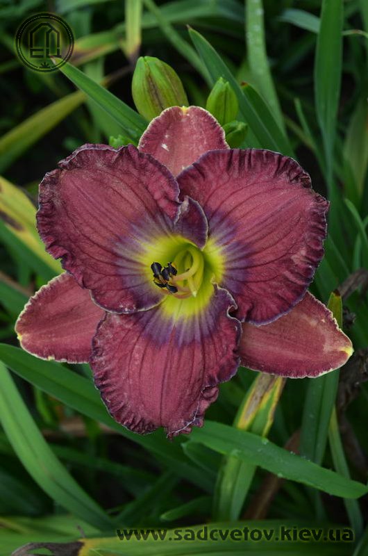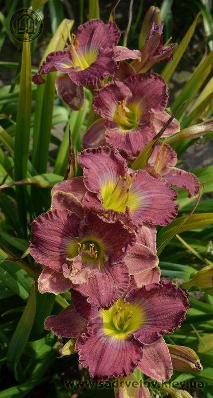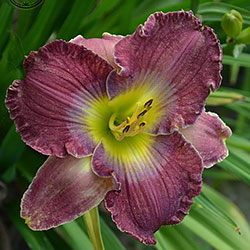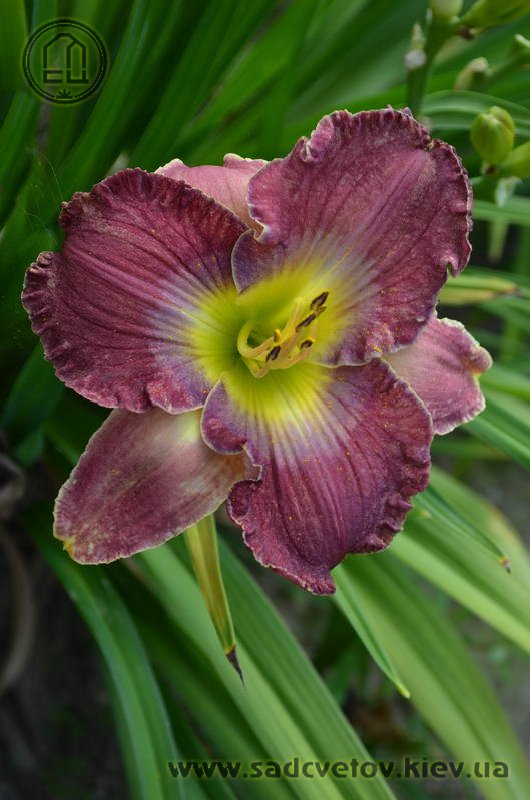 Гофрований ліловий з світлим димчастим сіро-блакитним оком навколо лимонного горлечка і легким затемненням по краю пелюсток.
