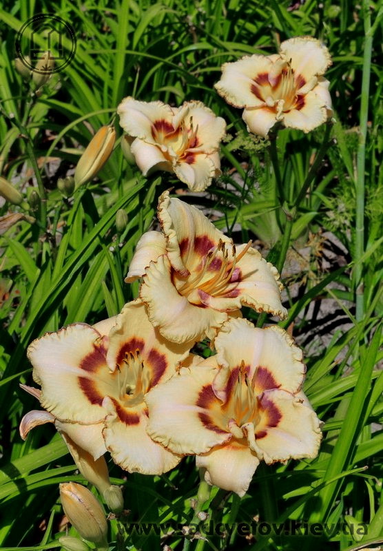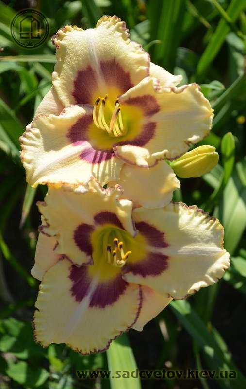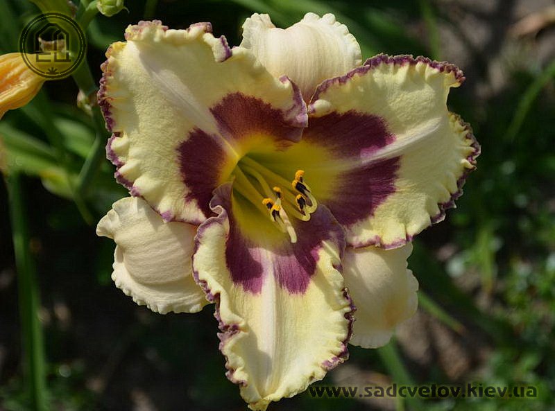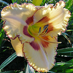 Молочно-кремовий з сливово-фіолетовим оком і такою ж тонкою каймою по гофрованому краю пелюстки.