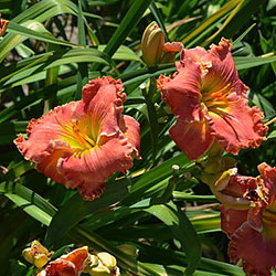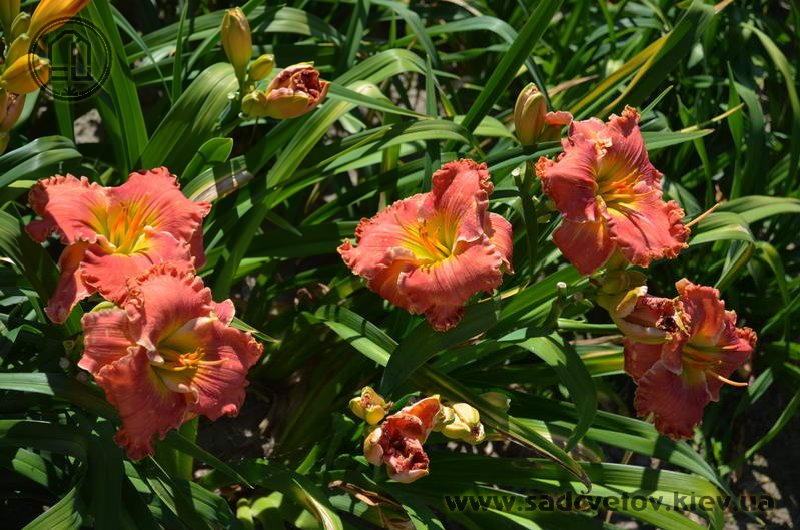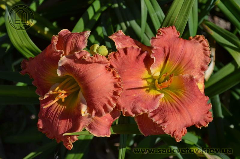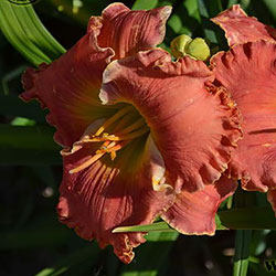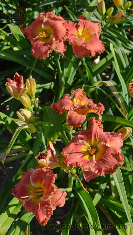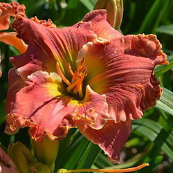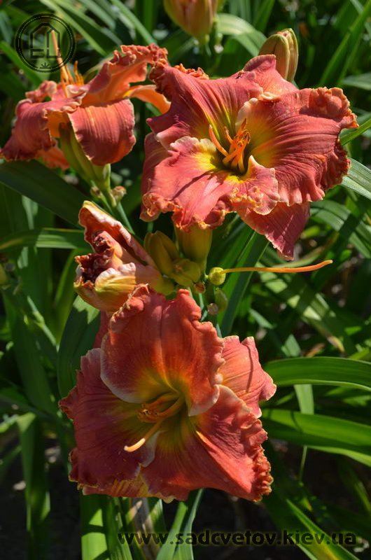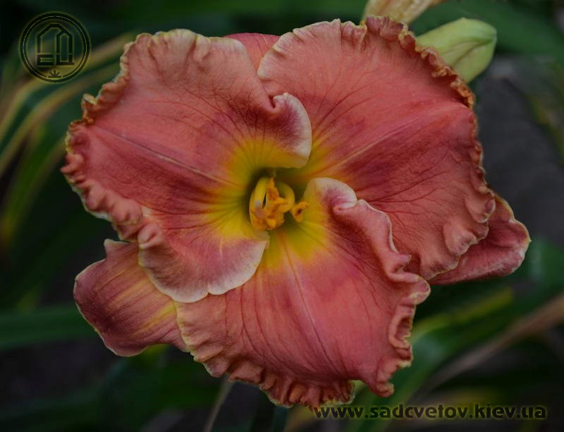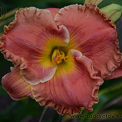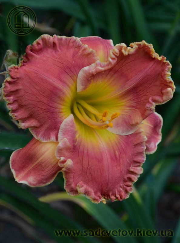 Добре гофрований, насичений темно-рожевий з акварельним розмитим оком навколо жовто-лимонного горла, золотиста облямівка по краю.