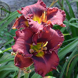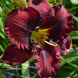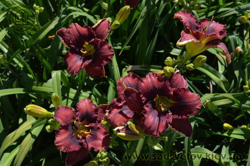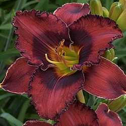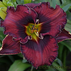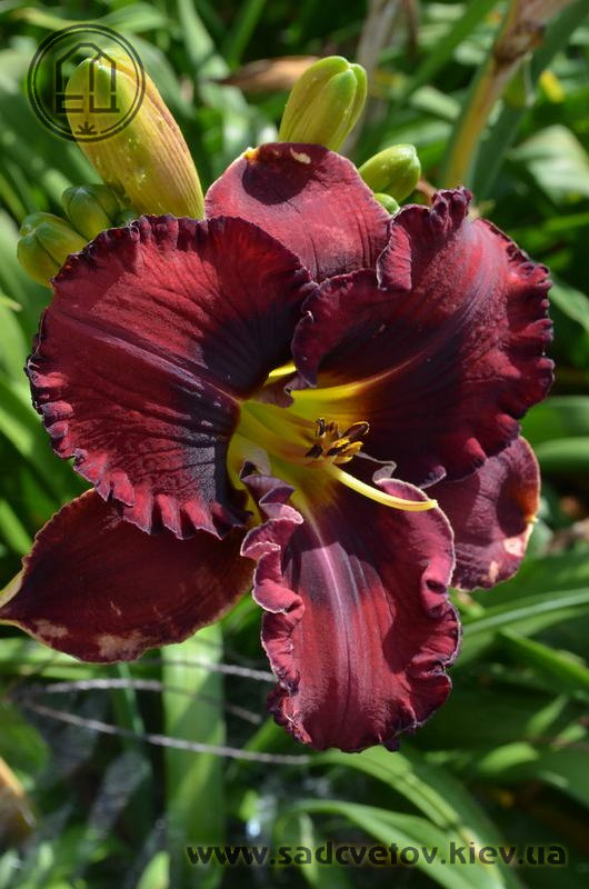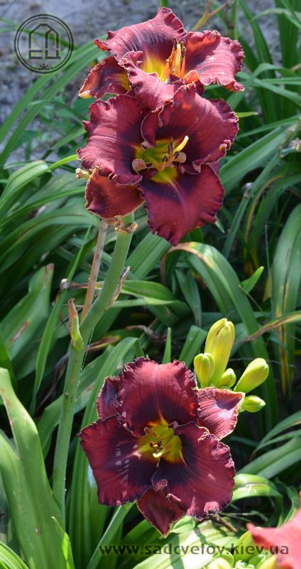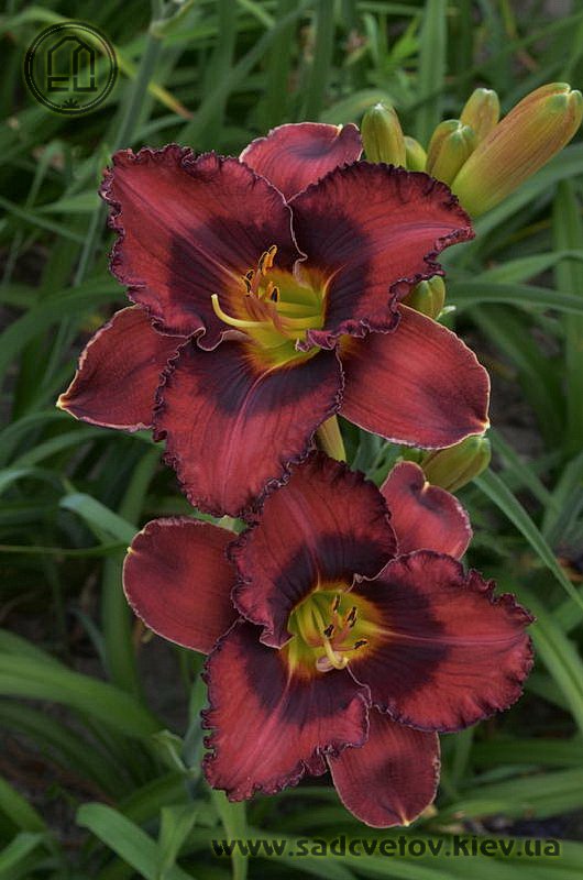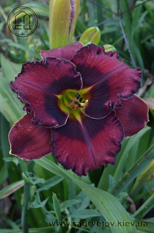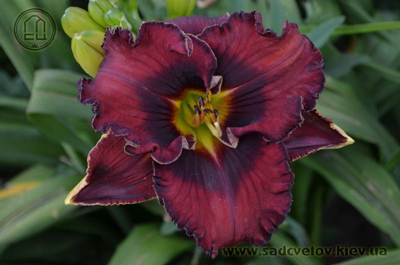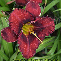 Темний вишневий з чорно-вишневим оком і такою ж гофрованою тонкою каймою, горло - від оранжевого через жовтий до лимонно-зеленого.