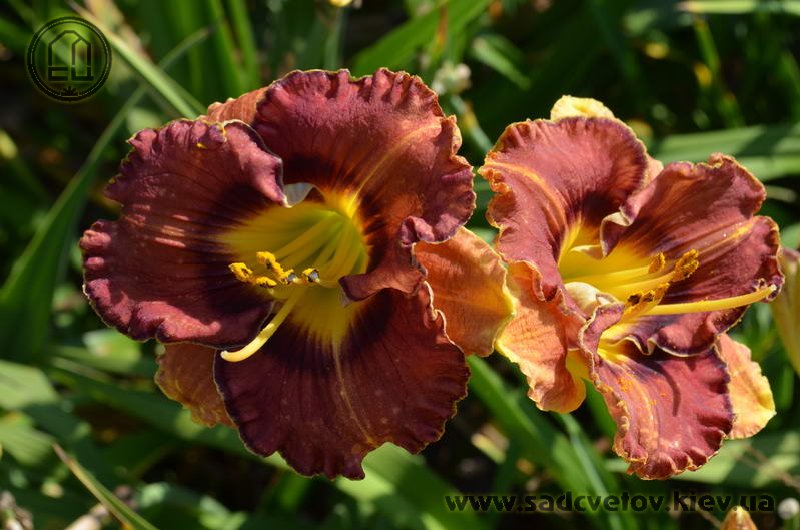 Круглий гофрований мандариново-червоний з контрастним темним бордовим оком і тонкою каймою цього ж кольору окантованою найтоншою жовтою ниткою по торця пелюстки, горло жовте з лимонно-зеленою серединкою.
