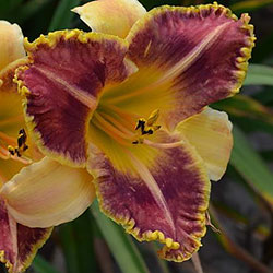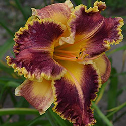 Гофрований червоно-коричневий з темно-вишневим оком, лимонним горлом, ярко вираженою двоколірною (око, горло) облямівкою і світлими помаранчевими променями по середині пелюстки.