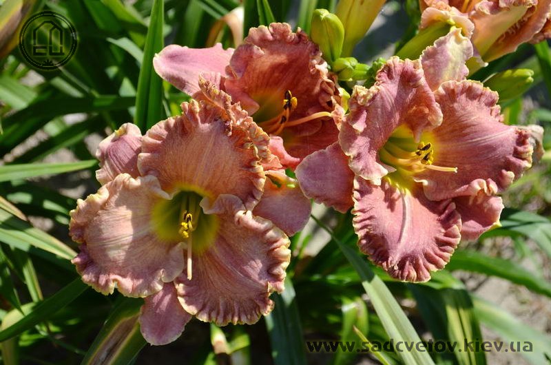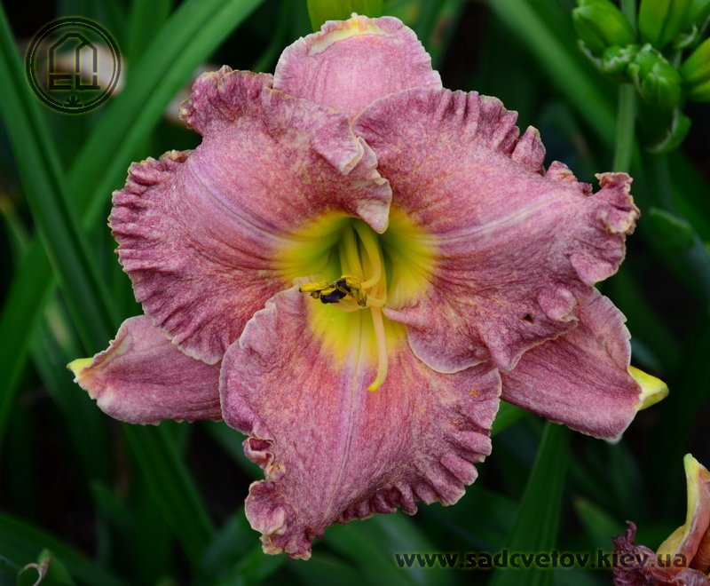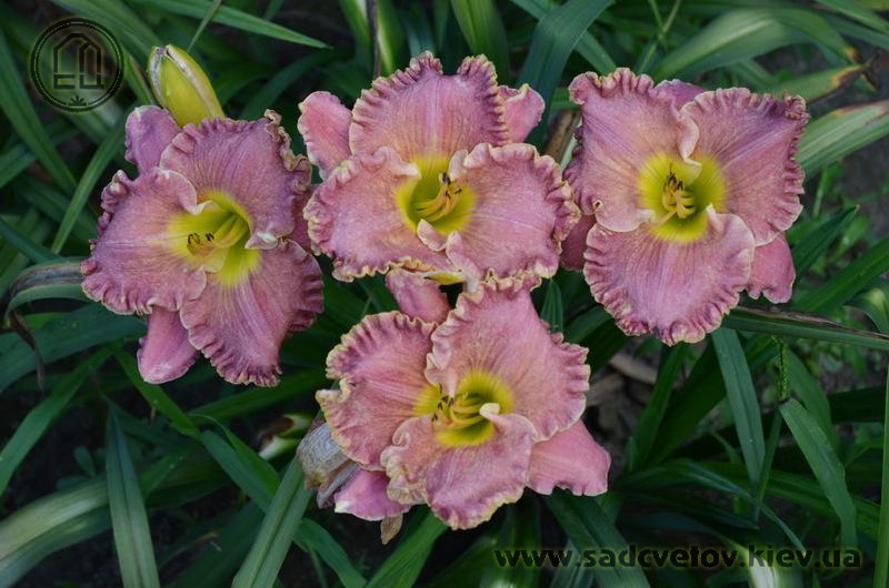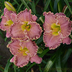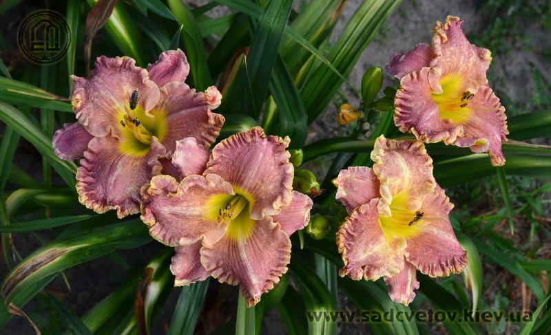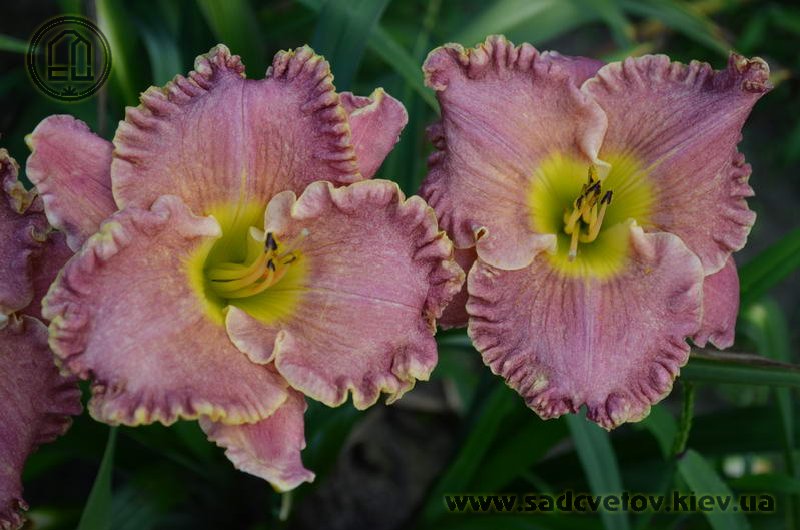 Незвичайний муаровий рожевий з золотистими і сріблястими вкрапленнями з широко гофрованим краєм, лимонно-зелене горло.