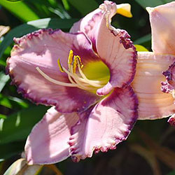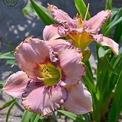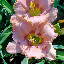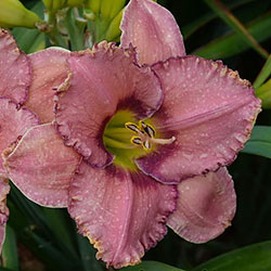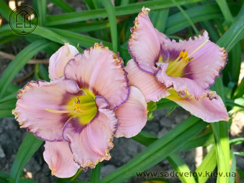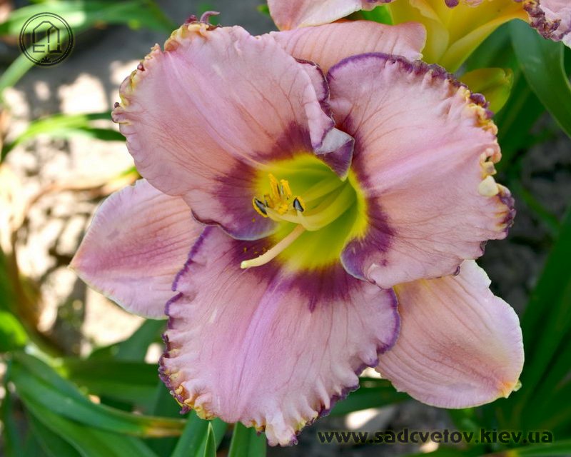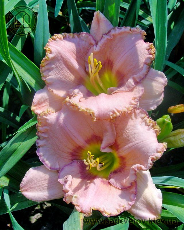 Рожевий з фіолетово-малиновим оком і облямівкою по гофрованому з золотистими мереживами краю, лимонно-зелене горло.