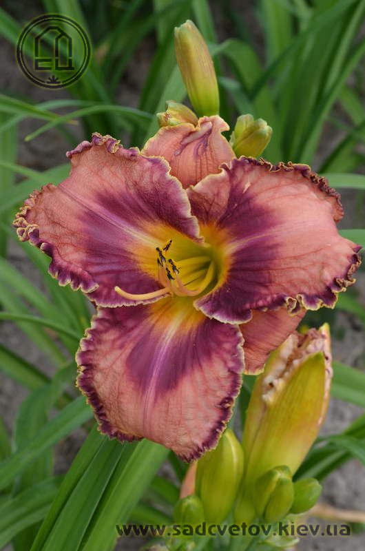 Рожевий з сливово-бордовим оком, лимонним горлом і двокольоровою акуратною облямівкою кольору ока в поєднанні з білою окантовкою по торцях.