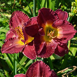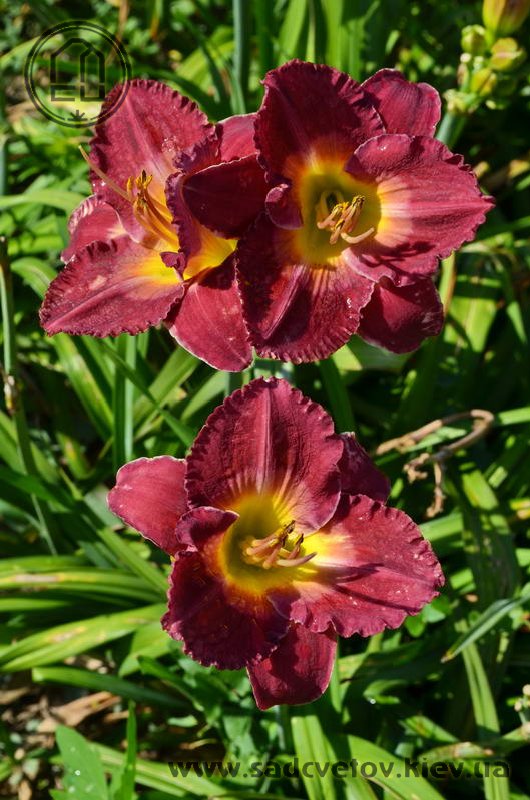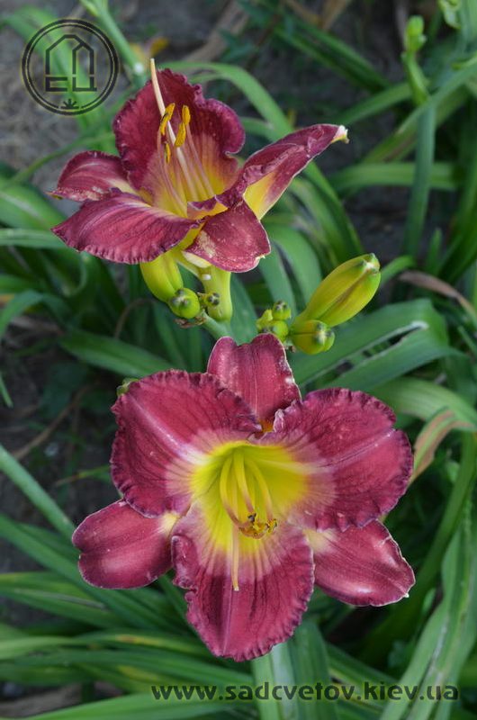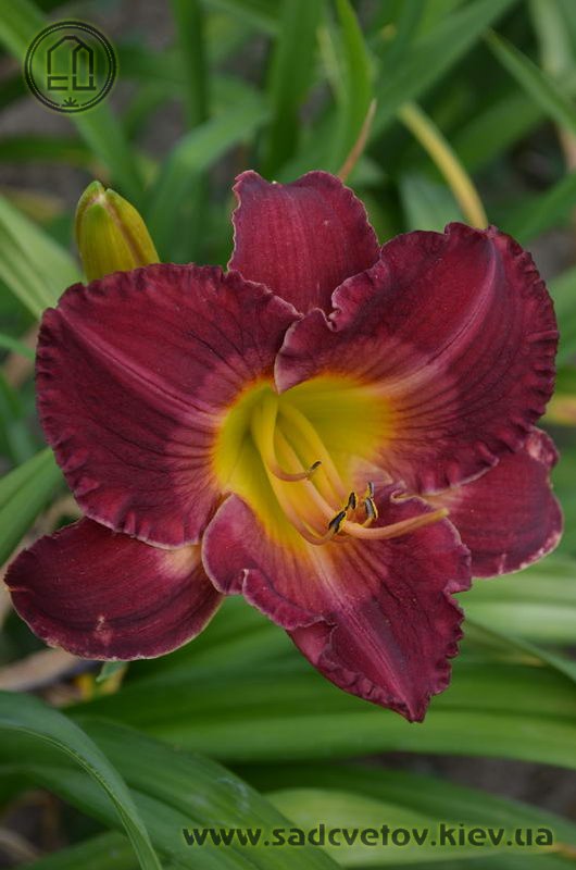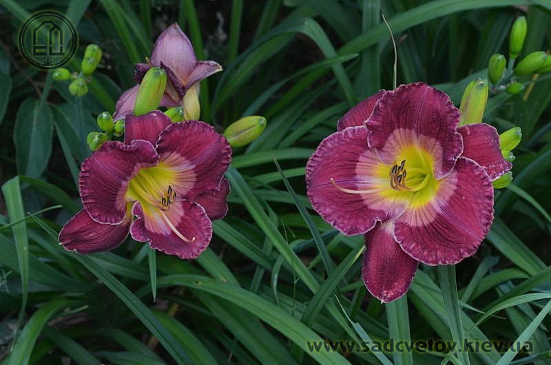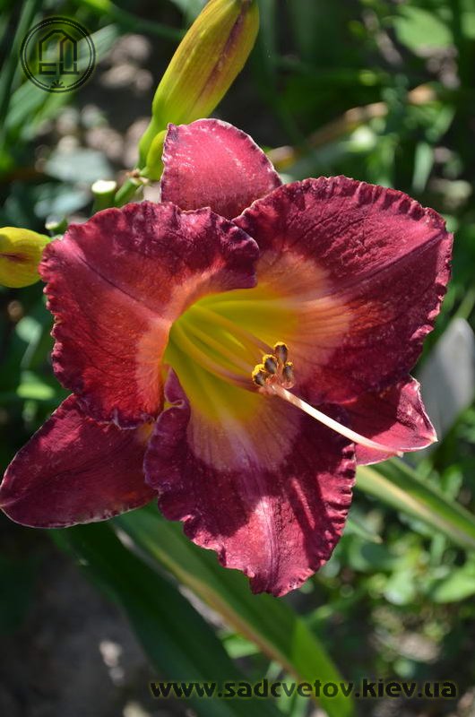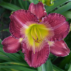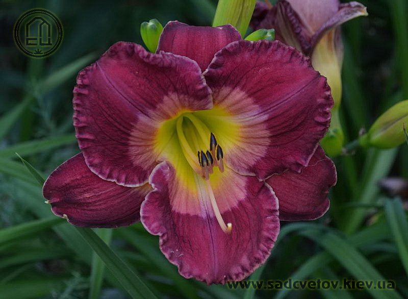 Гофрований насичений малиновий зі світлим рожевим оком навколо лимонно-зеленуватого горлечка.