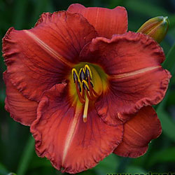 Червоний гофрований з лимонно-зеленим горлом, і радіальними жовтими смужками уздовж пелюсток.