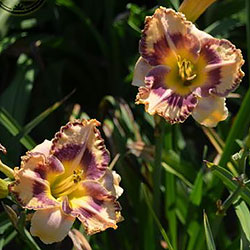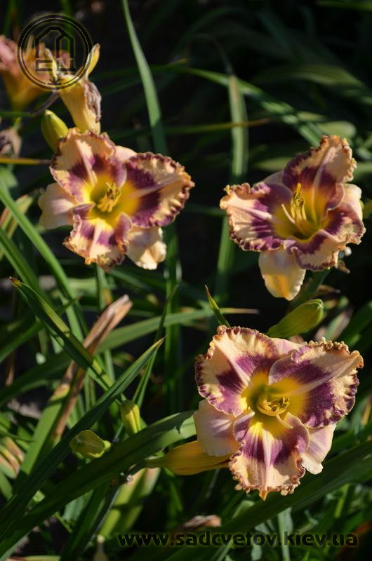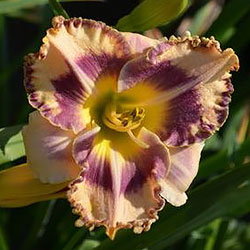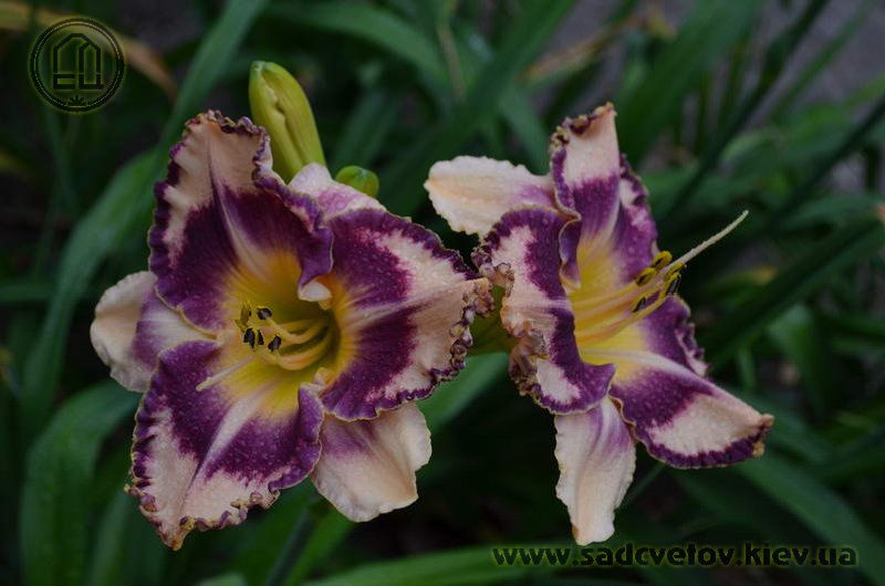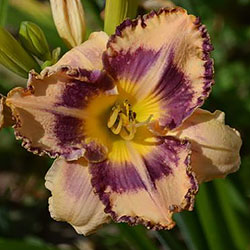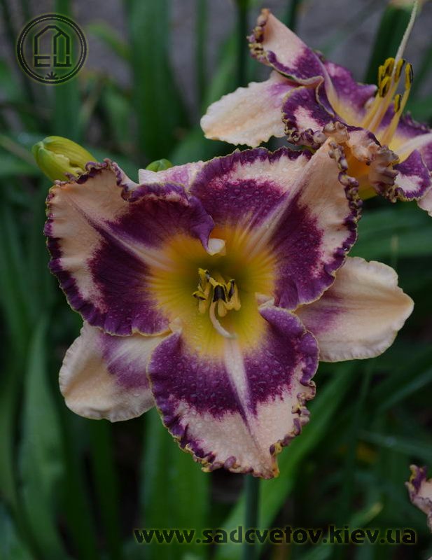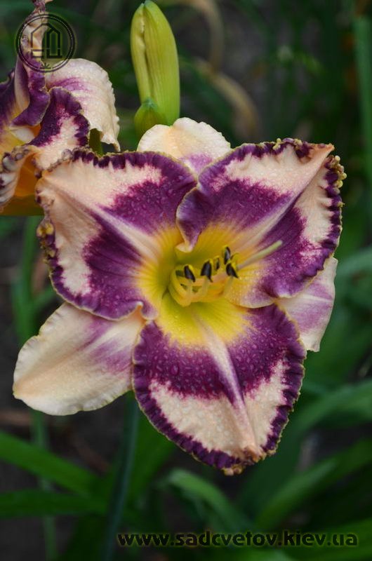 Гофрований кремовий з темним чорнильно-сливовим оком в поєднанні з такою ж широкою облямівкою, жовто-лимонне горло і світлий лимонний торець гофрованих пелюсток.